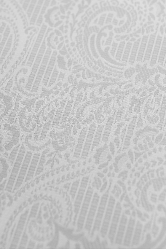 Italienskt jacquardkostymtyg med Paisleymotiv i ljusgrått. Tyget är tunt, något styvt, mycket elastiskt. Perfekt för att sy en klänning, kostym, kjol eller för dekorativa ändamål. Sammansättning: 100% polyester