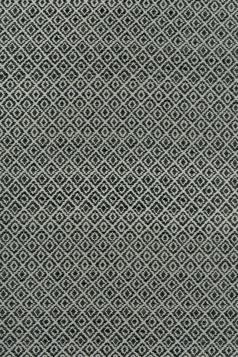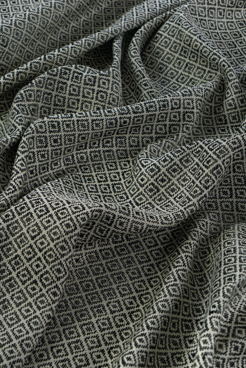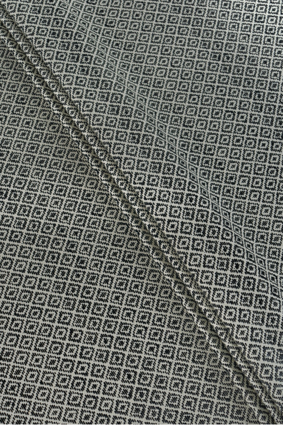 Italiensk jacquardkostym tyg i écru med svart raffia. Tyg med ett motiv av små diamanter (3,5 cm). Tyget är tjockare, styvt, icke-elastiskt med en karakteristisk glans. Perfekt för att sy en klänning, kostym, kjol eller för dekorativa ändamål.