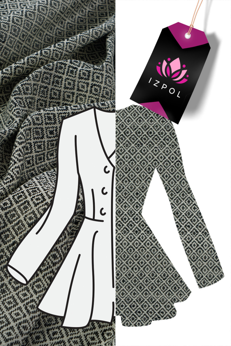 Italiensk jacquarddräkt i écru med svart raffia. Tyg med ett motiv av små diamanter (3,5 cm). Tyget är tjockare, styvt, icke-elastiskt med en karakteristisk glans.
