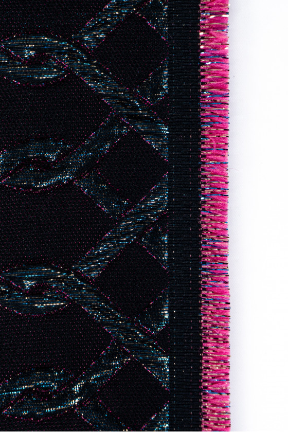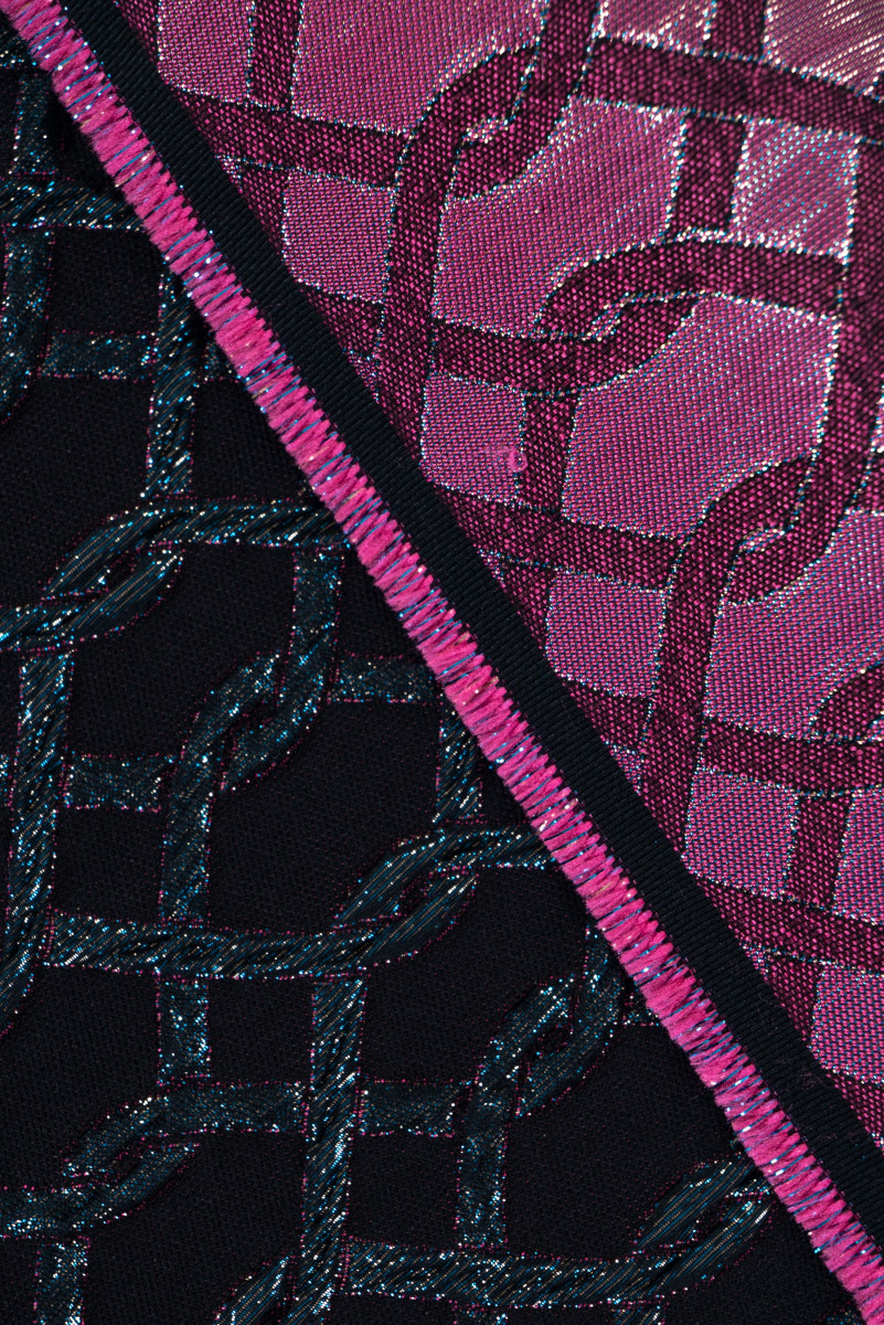 Italienskt jacquardkostymtyg i svart och rosa med prägling som liknar ett sammanvävt snöre, vackert dekorerat med mångfärgad lurextråd. Tyget är tjockare, köttigt, elastiskt längs tygets längd.