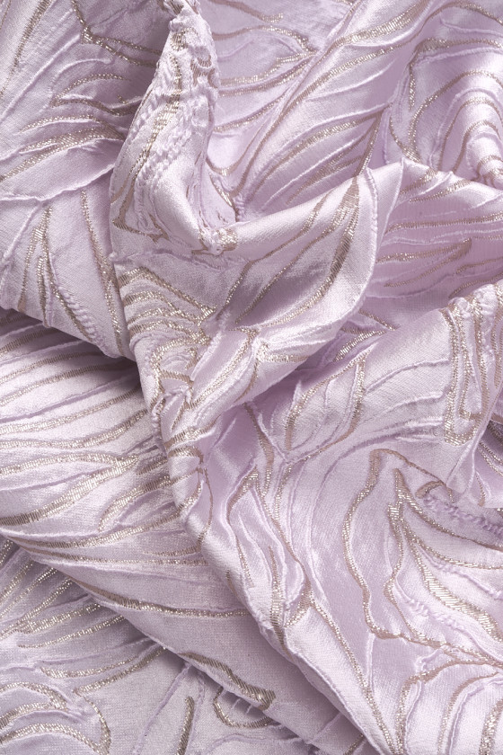 Italienskt jacquardtyg i lila och platina med motiv av stora, lätt konvexa blommor. Medeltjockt, icke-elastiskt, styvt tyg.