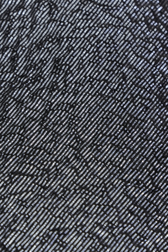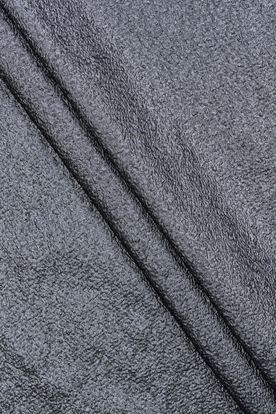 Italienskt jacquardtyg i grafitfärg med konvex struktur och glans. Tyget är lätt, transparent, icke-elastiskt och passar som organza. Ett mycket intressant förslag från vilket du kan skapa en elegant klänning, kjol och blus.