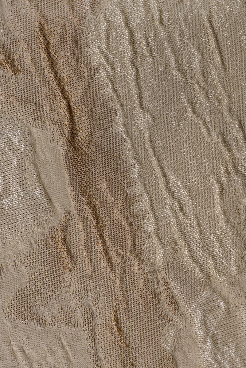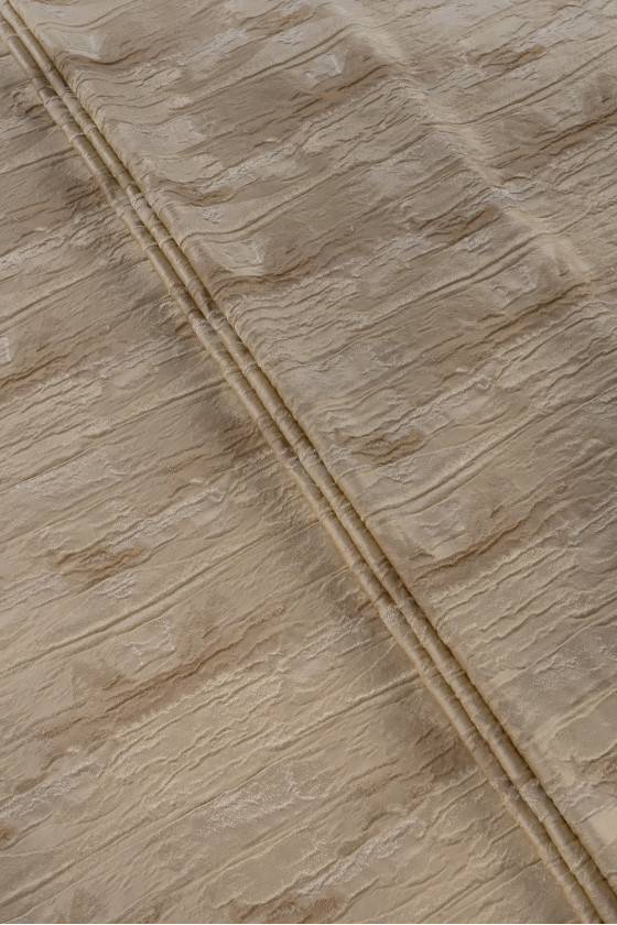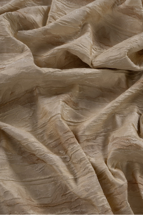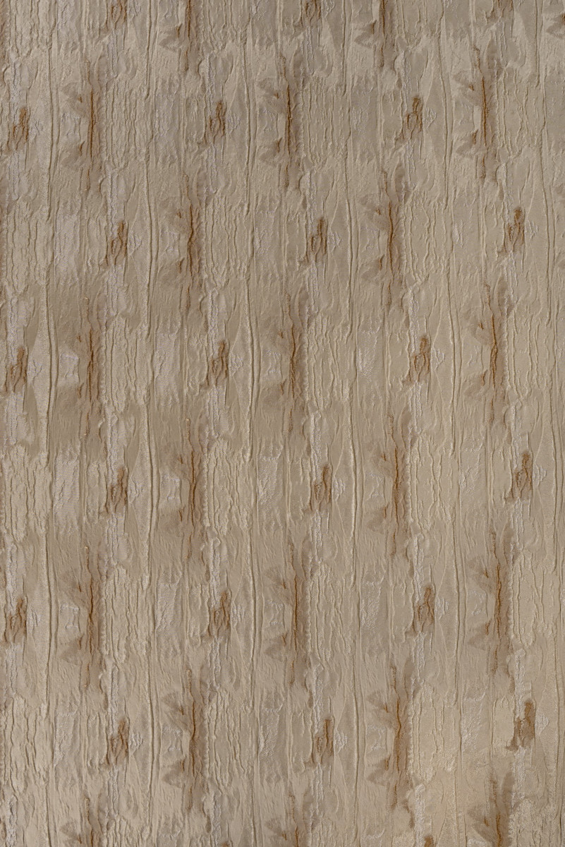 Italienskt jacquardkostymtyg i beige med ett motiv av tjusiga mönster. Tyget är något styvt, skuggat, inte elastiskt.