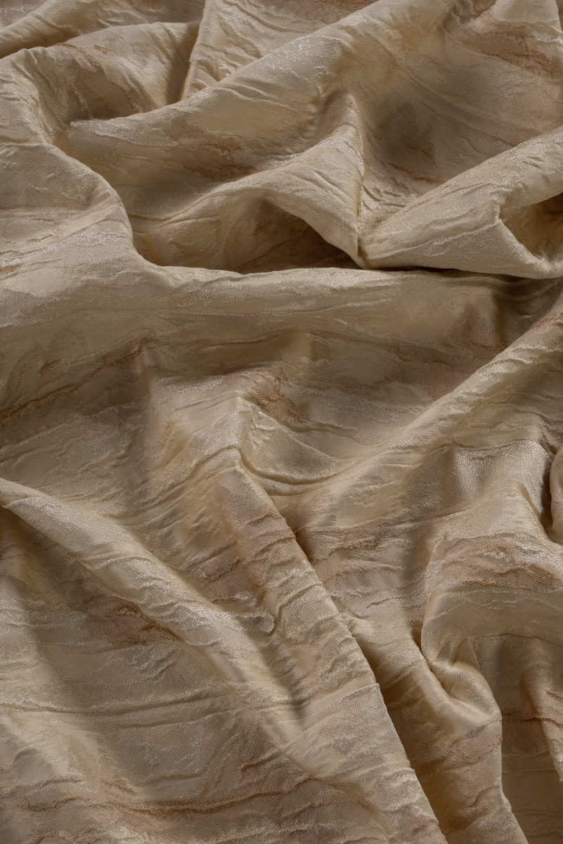 Italienskt jacquardkostymtyg i beige med ett motiv av tjusiga mönster. Något styvt, skuggat, icke-elastiskt tyg - perfekt för att sy en kostym, klänning, kjol, jacka eller för dekorativa ändamål.