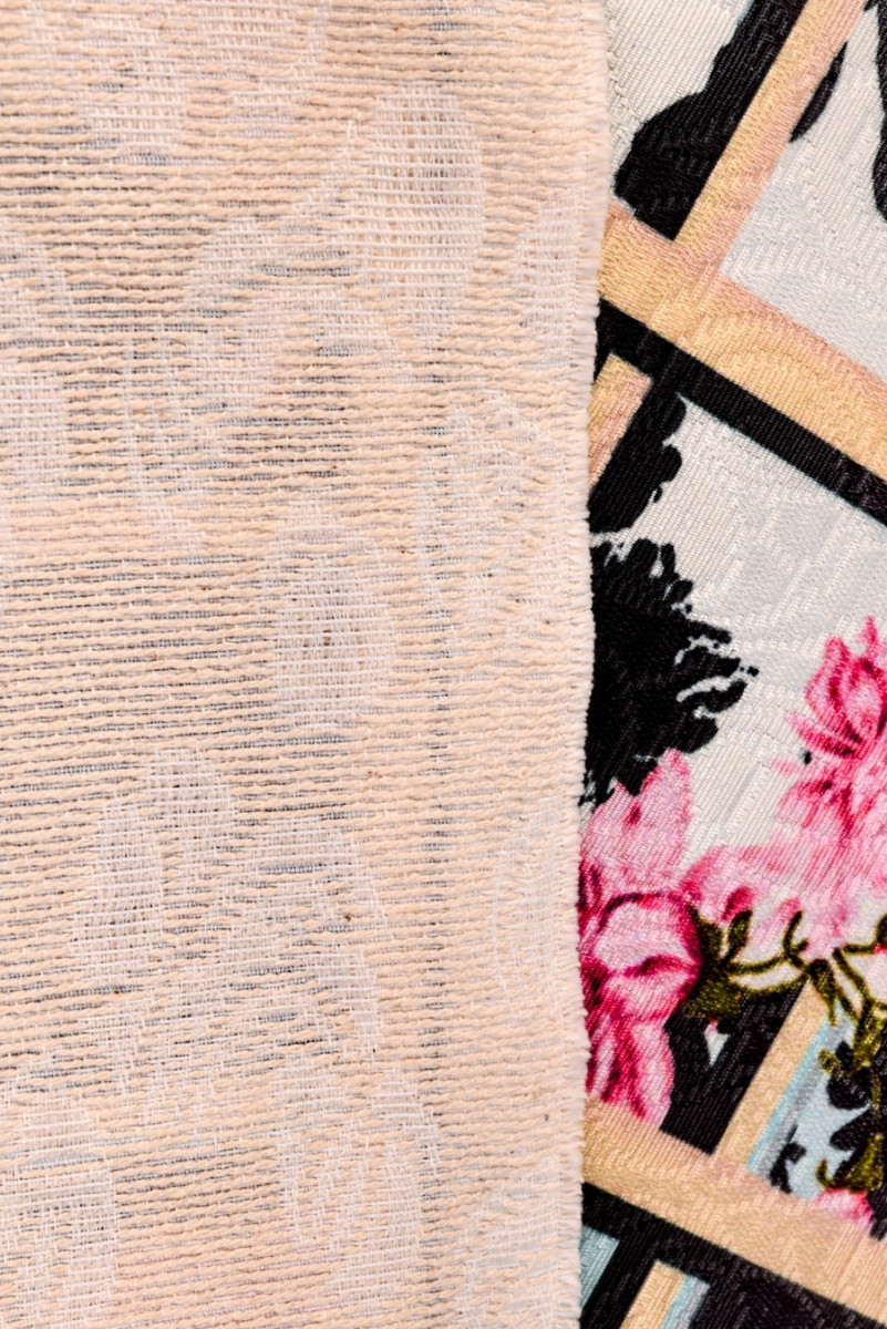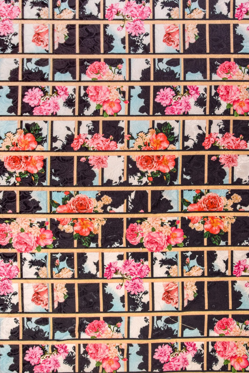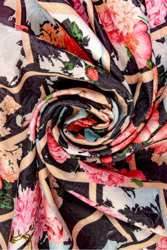 Jacquard med en präglad struktur med ett tryck av blommor placerade i rutor. Ett mönster på en grön och svart bakgrund föreställande blommor i rött, rosa och beige.