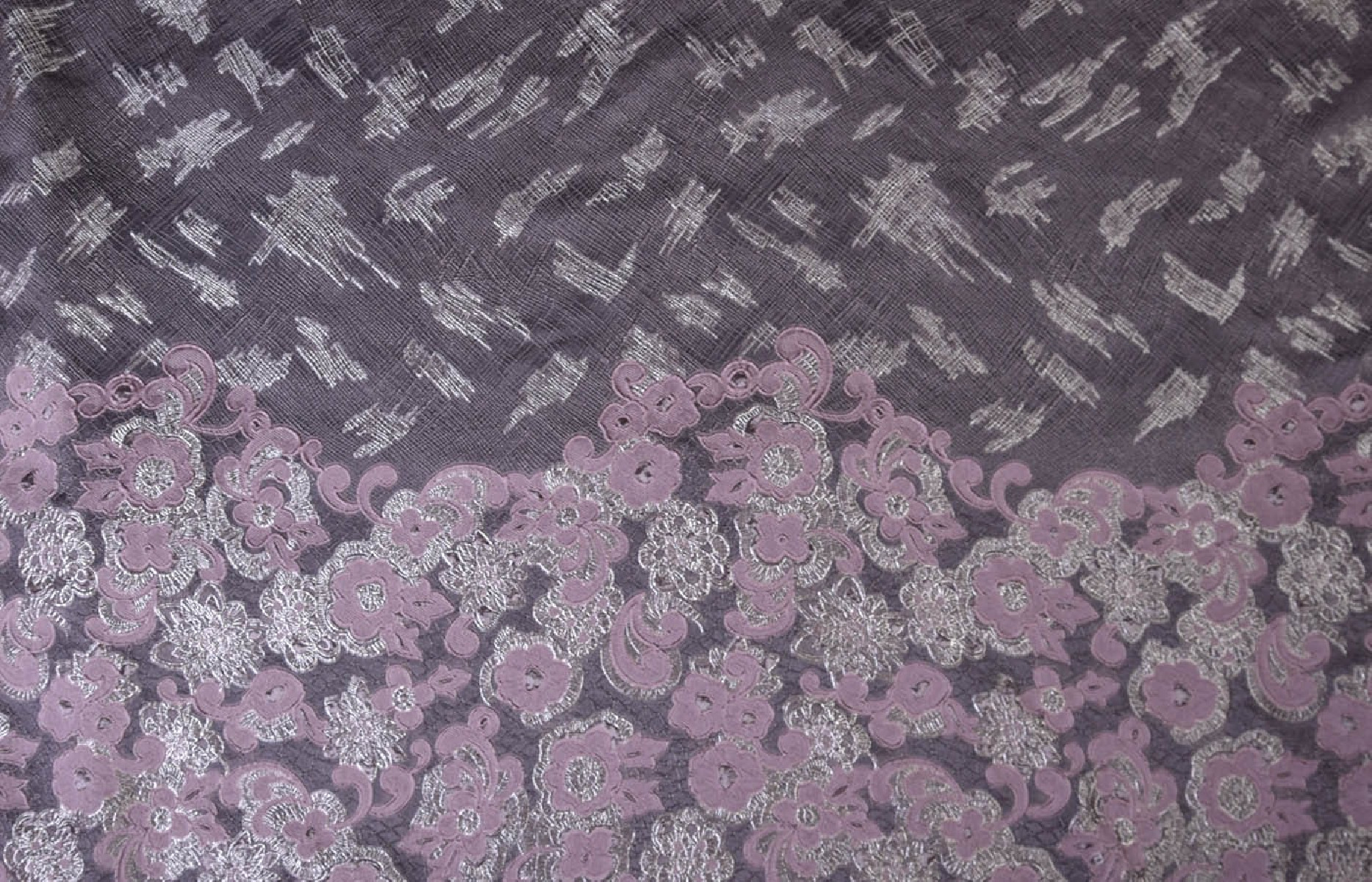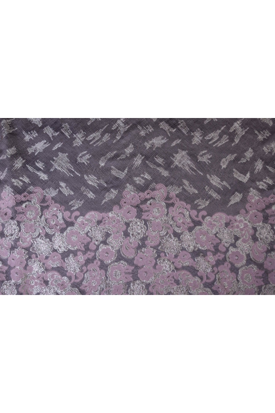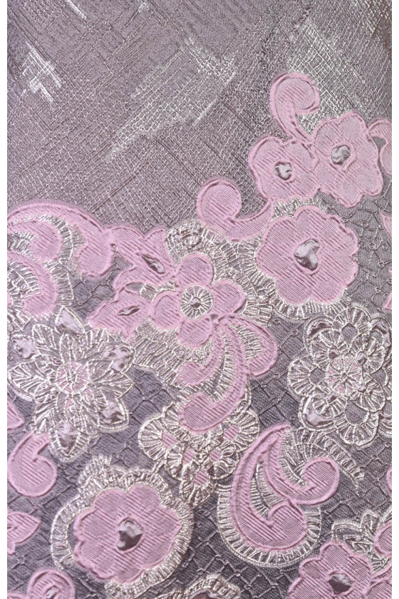 Ett mycket rikt jacquardkostymtyg i smutsrosa och guld med ett blommotiv längs ena kanten - tyget är sytt runt omkrets. Tyget är mjukt, icke-elastiskt, lätt transparent.
