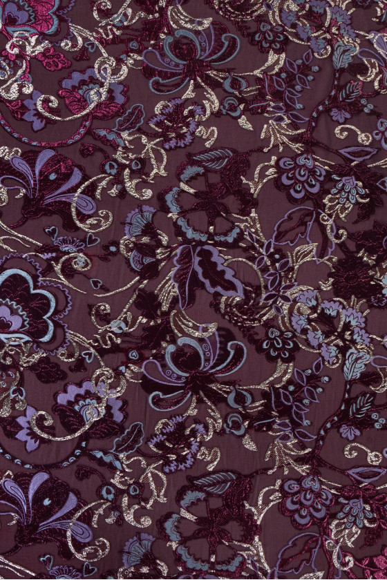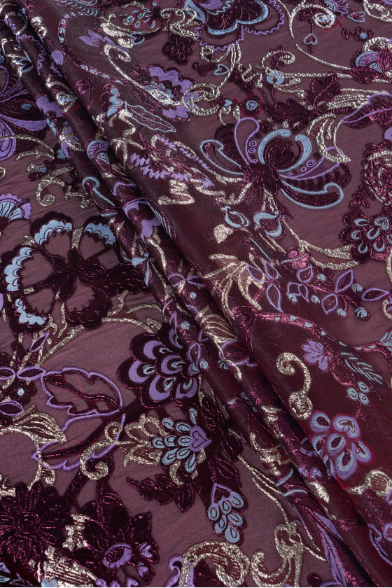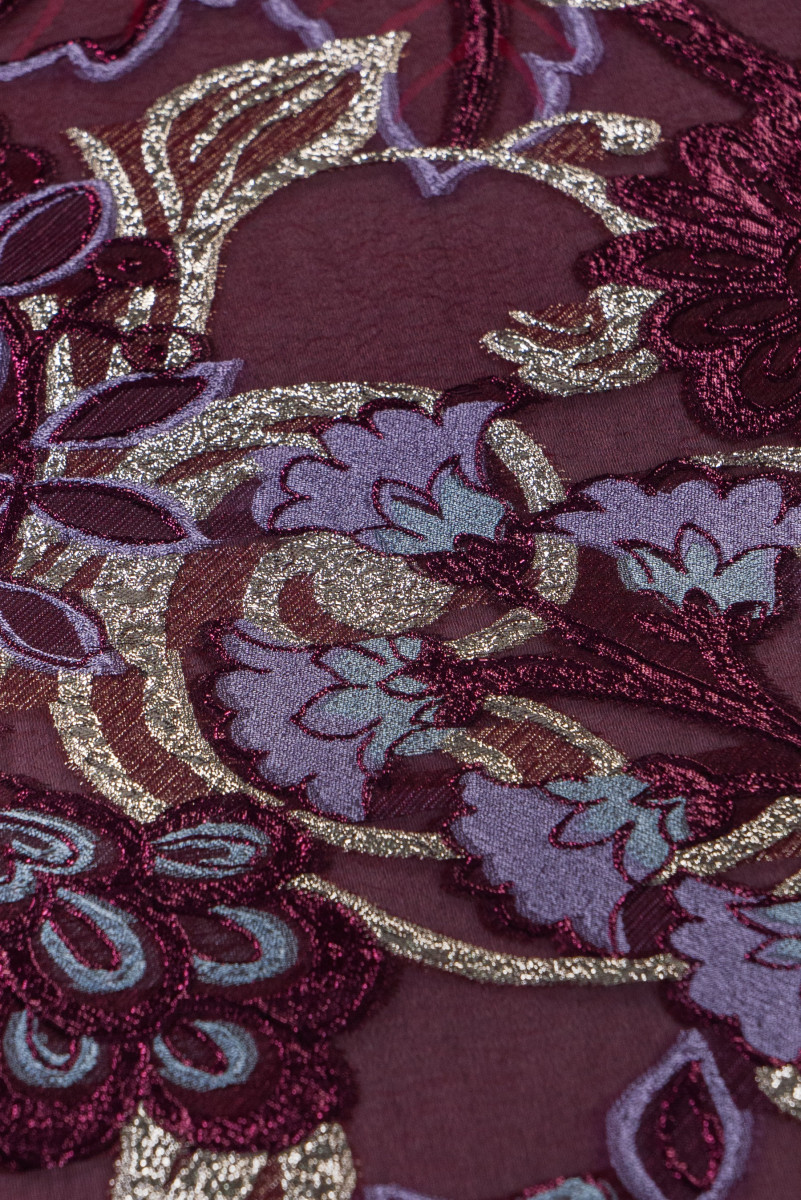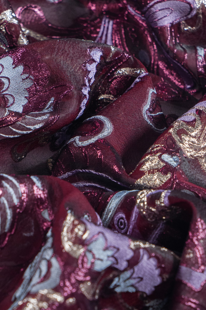 Italienskt, elegant organzatyg med jacquardmönster. En mycket exklusiv produkt tillverkad av naturligt siden i vinrött med polyester, orientaliskt broderi i vinrött och ljung, dekorerad med en glänsande tråd. Organza är tunt och transparent, men samtidigt styvt, vilket ger tyget lätthet och det rika mönstret gör det till ett fantastiskt förslag för att sy en fenomenal klänning, blus eller kjol.