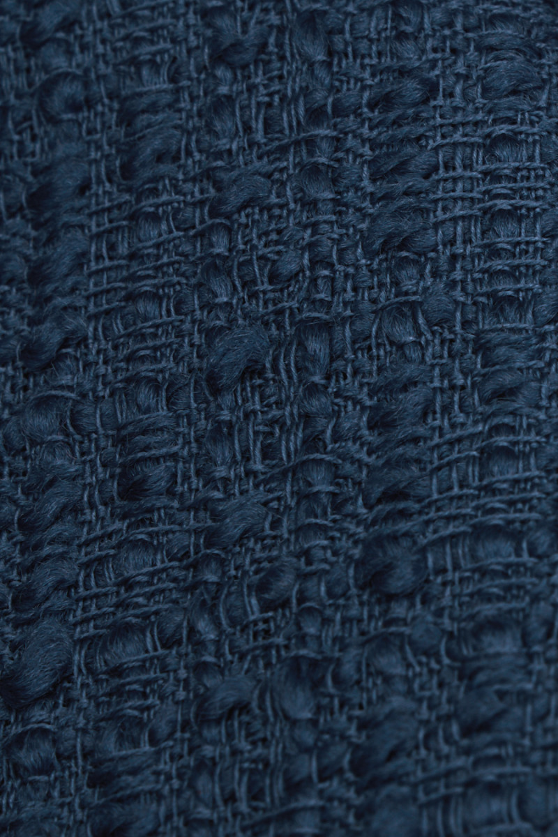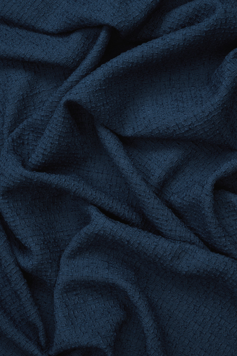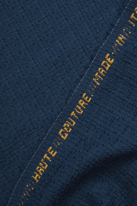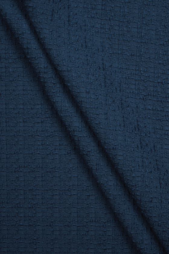Italiensk chanelull med en delikat boucleväv i blå-denimfärg. Tyg av högsta kvalitet, som kommer från en av de mest kända fabrikerna i Italien. Andra färger finns också!