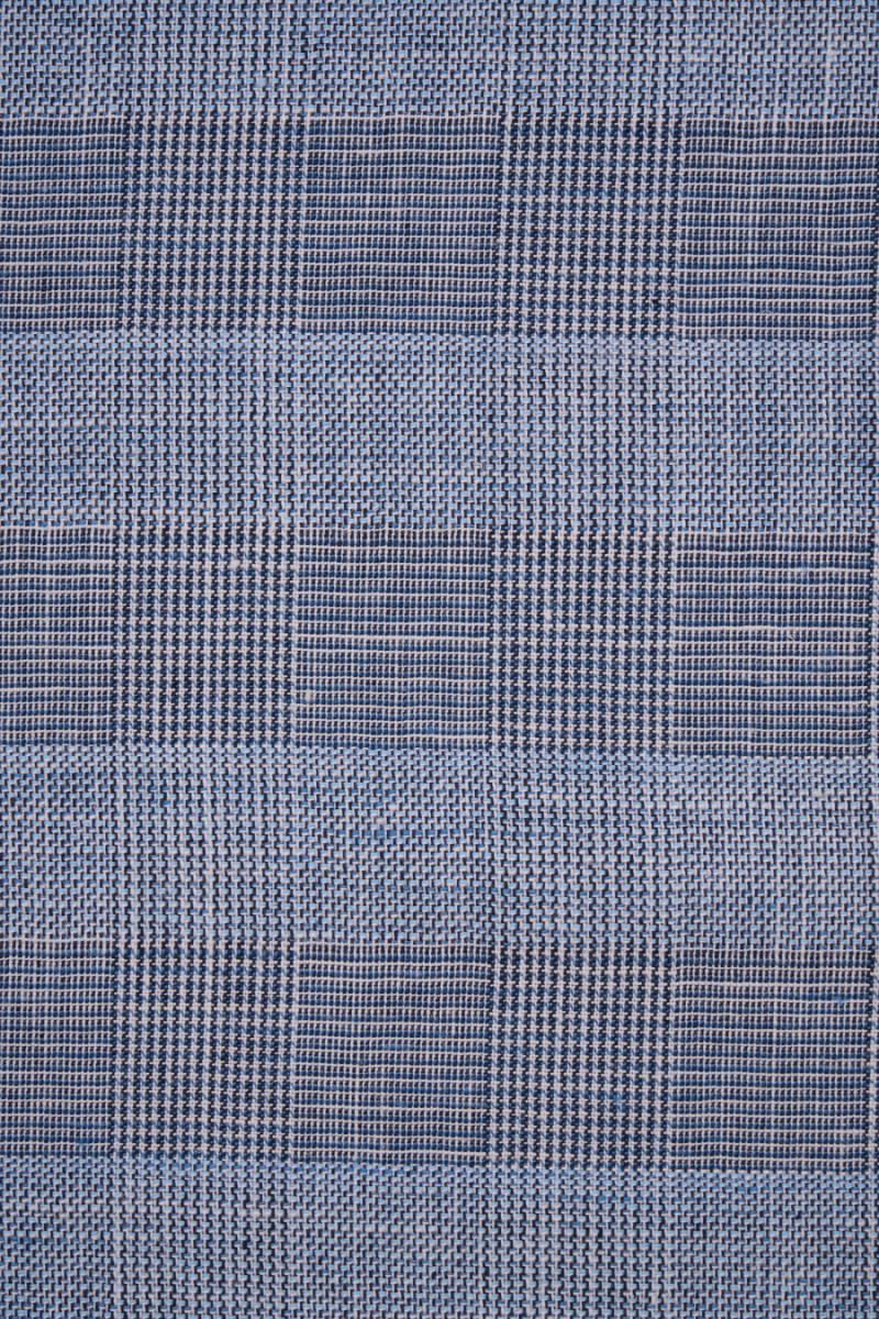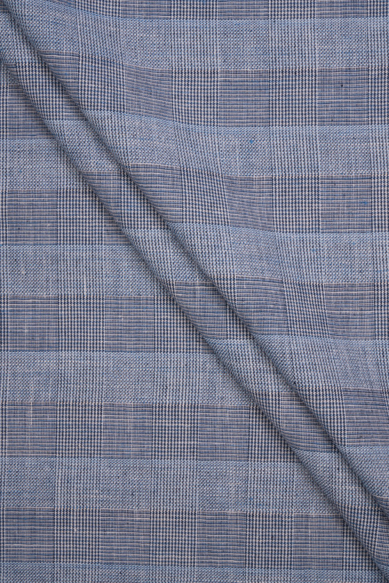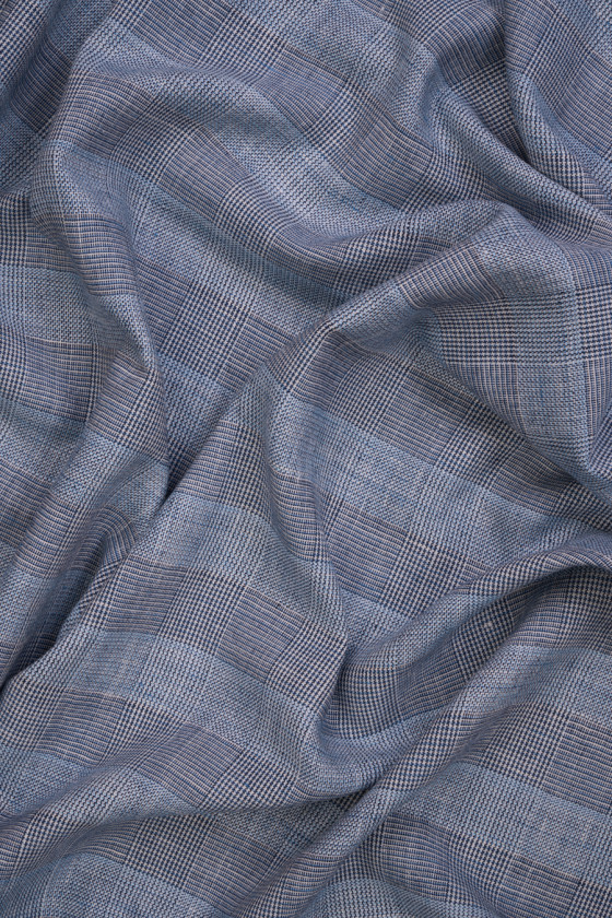 Italienskt linne- och bomullstyg med rutmönster, storlek 4 cm * 4 cm. Tyget är tillverkat av blå, vita och marinblå trådar. Den är tunn, oelastisk, med en något lös väv. Ett bra förslag för sommaren, från vilket du kan trolla fram en jacka, klänning, kjol.