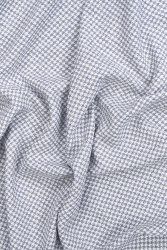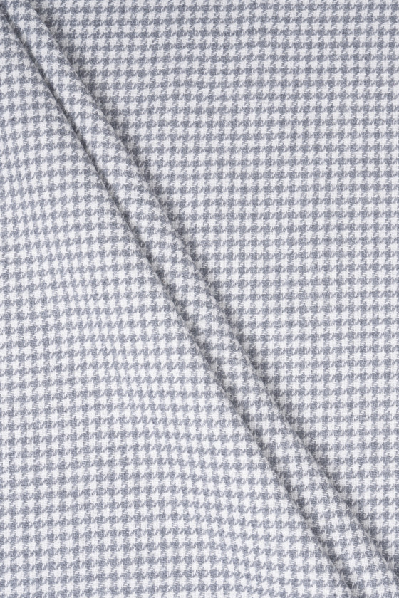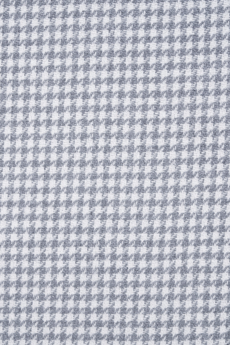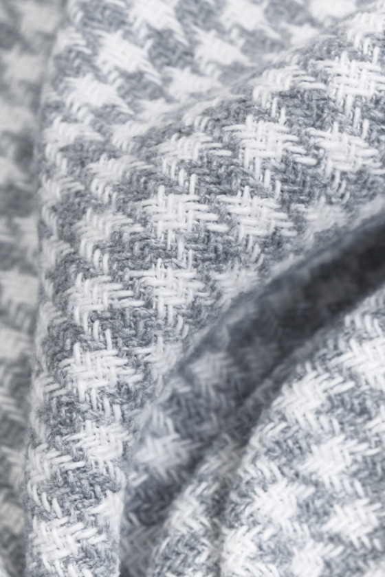 Italienskt bomullstyg med linne och polyester med ett litet kycklingfotsmotiv i ljusgrått och cremefärgat. Tyget är köttigt, oelastiskt, med en något lös väv, men helt ogenomskinligt. Ett klassiskt förslag för byxor, jackor, klänningar, kjolar och shorts.