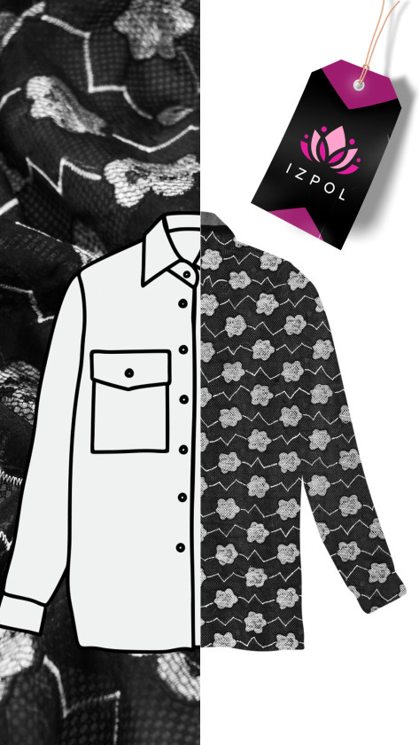 Italienskt 100% sidenorganzatyg i svart med broderade grå blommor och sicksack. Tyget är fodrat med ett svart nät med stora maskor. Naturlig sidenorganza är ett tunt, transparent men styvt tyg med en delikat glans som är karakteristisk för sidentyger. Perfekt för att sy klänning, blus, skjorta, kjol. Vi syr den omkrets.