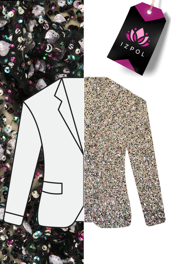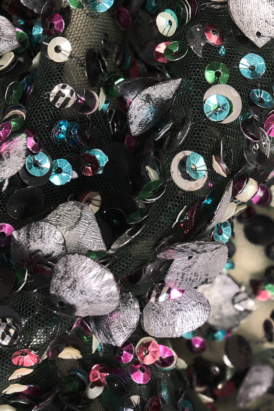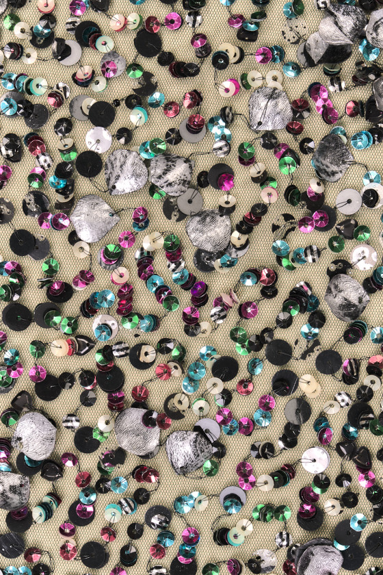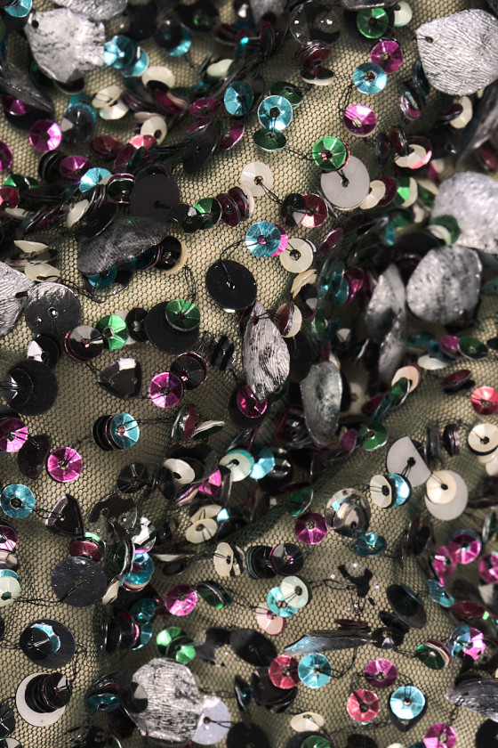 Italiensk styv tyll med klassiska öljetter i buteljgrönt. Den är mycket rikt dekorerad med paljetter i fuchsia, grönt, turkos, svart och grått skal med en diameter på ca 1 cm. Paljetterna och skalen tjocknar mot tygets ena kant - vi syr det runt om. Tyget är mycket effektivt, transparent (kräver foder), tungt och oelastiskt. Ett fantastiskt förslag för att sy en aftonklänning, kjol eller blus i en mycket intressant upplaga.