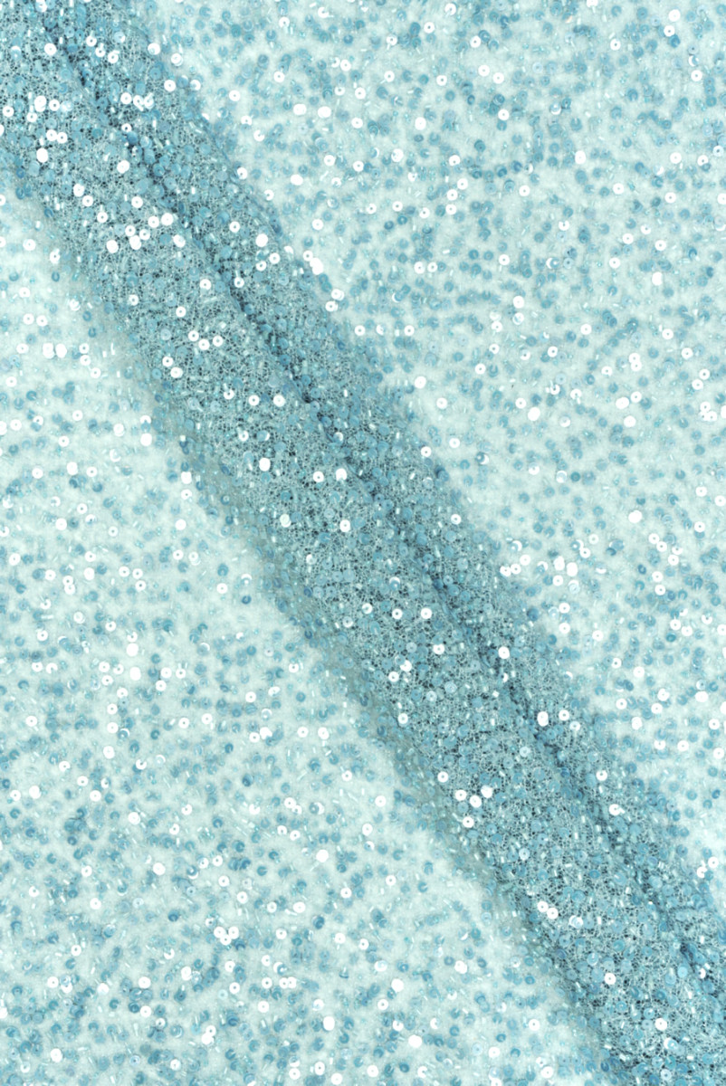 Italienskt tyg i form av ett nät med oregelbundna öljetter i blått, rikt dekorerat med pärlor och paljetter i samma färg. Tyget är genomskinligt (kräver foder), ganska tungt, något elastiskt och pärlorna och paljetterna lyser vackert. Ett fantastiskt och mycket effektivt förslag för att sy en aftonklänning, kjol eller blus.
