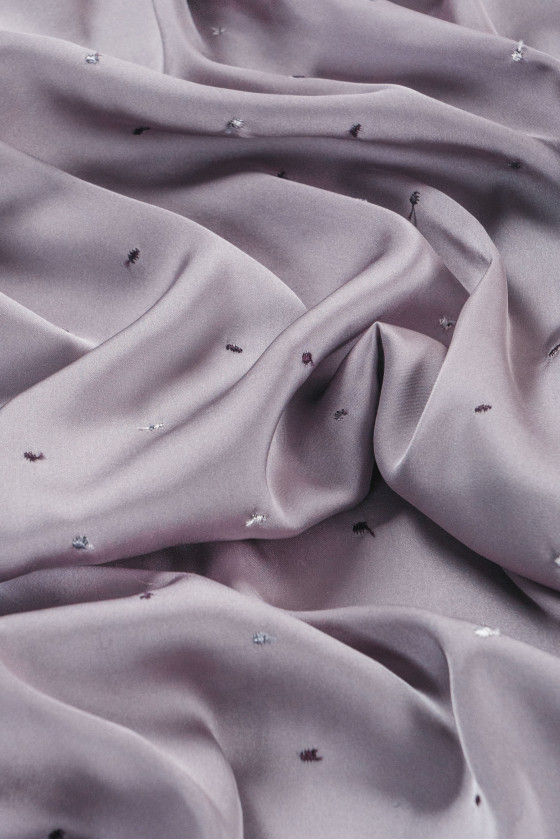 Italiensk polyestersatin i lila och grått med broderade, små prickar.