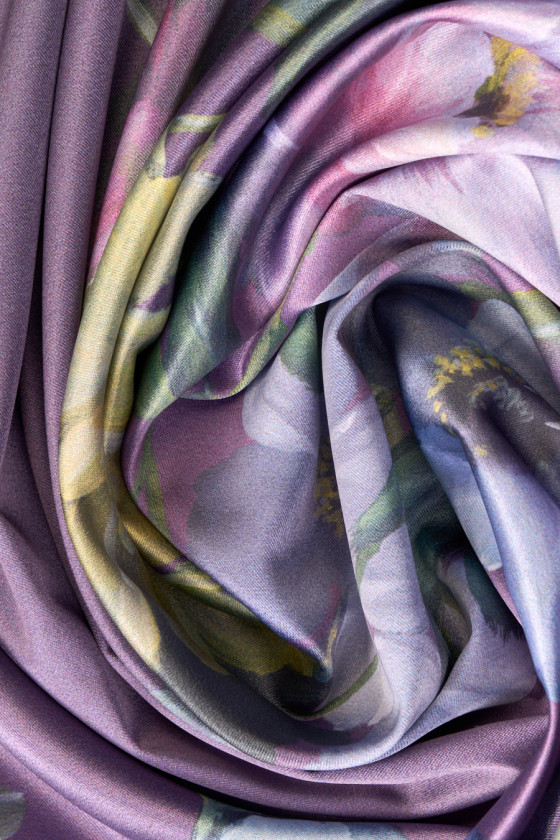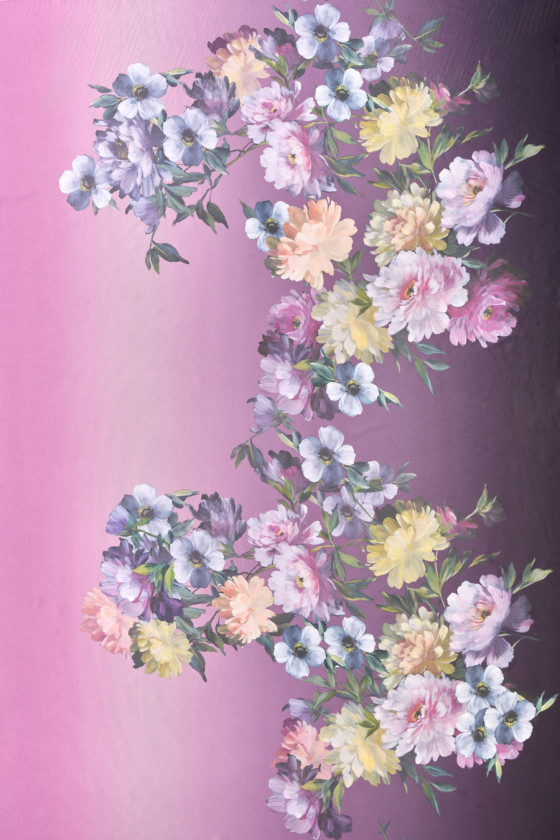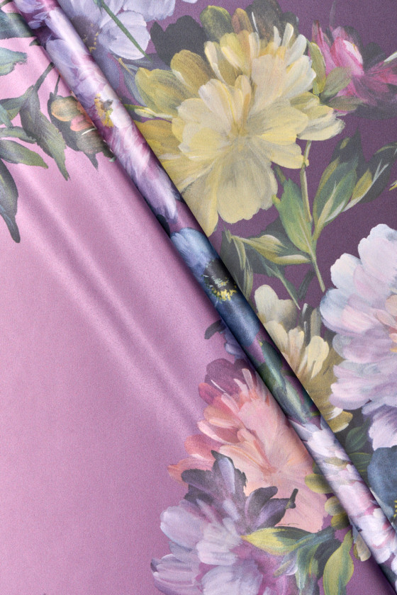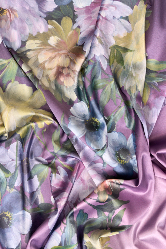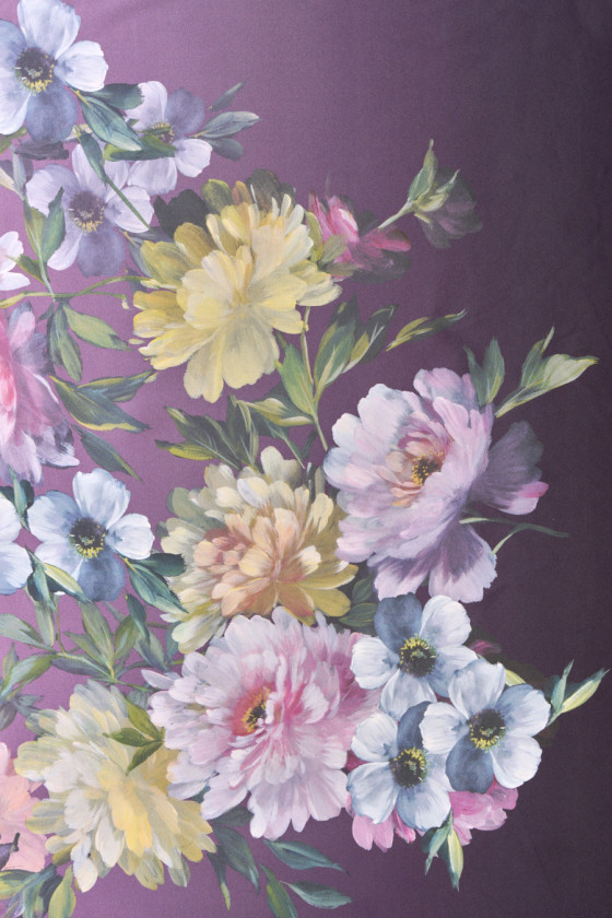 Italiensk polyestersatin med tillsats av elastan med ett motiv av stora, målade blommor på en skuggad lila bakgrund. Tyget kommer i kuponger 100cm*140cm. Tätt lagt blommönster 80 cm högt. Tyget är elastiskt, flytande, delikat vid beröring, mjukt och sitter vackert. Ett fantastiskt förslag för människor som letar efter unika och intressanta material för skjortor, kjolar, klänningar eller halsdukar.