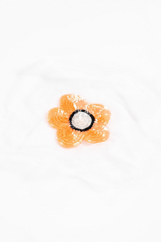 En intressant applikation i form av en blomma gjord av paljetter i följande färger: orange, svart och vit. Applikationen är sydd på vit tyll. Storlek ca 7 cm.