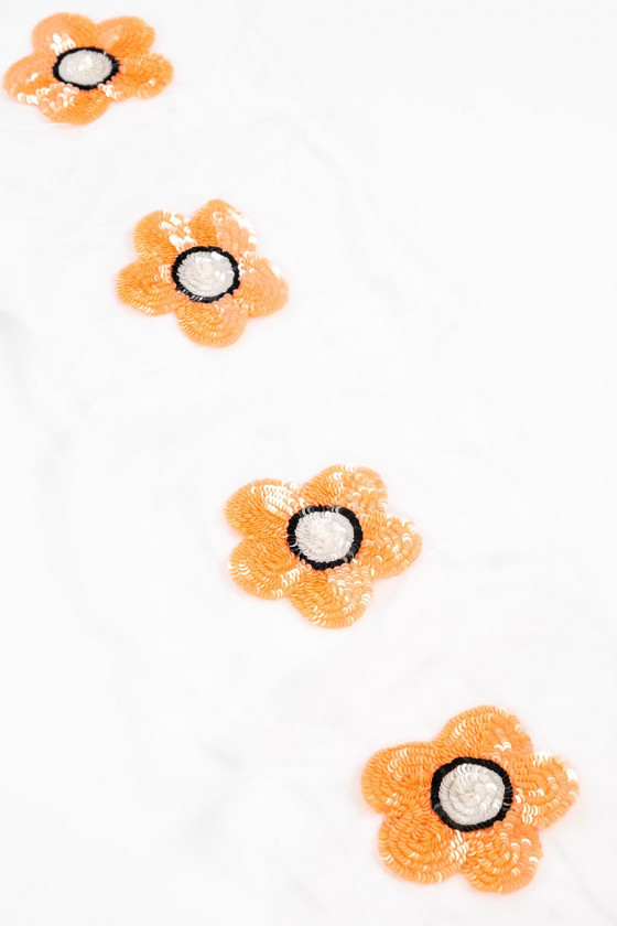 En intressant applikation i form av en blomma gjord av paljetter i följande färger: orange, svart och vit. Applikationen är sydd på vit tyll.