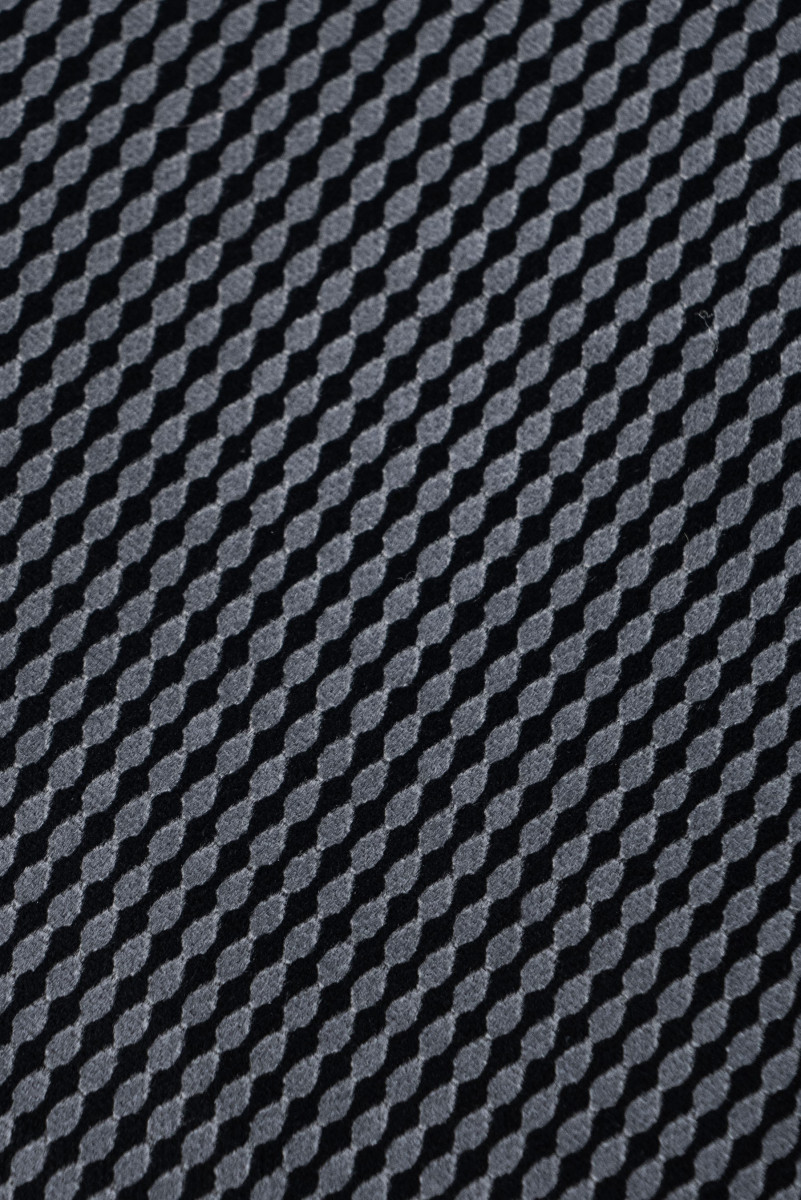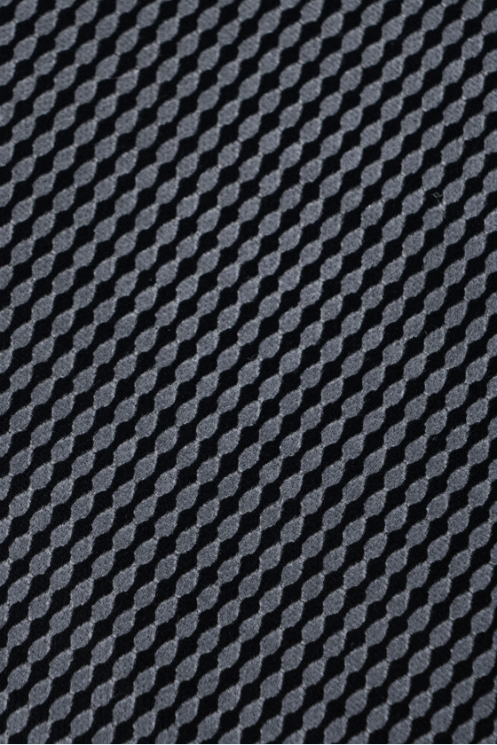 Italienskt sammetstyg med motiv av svart och grått, små mönster. Tyget är något styvt, oelastiskt med en delikat glans.