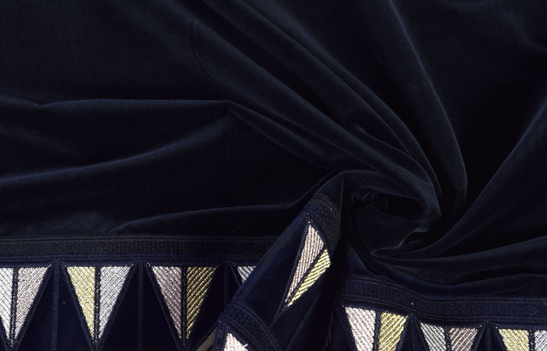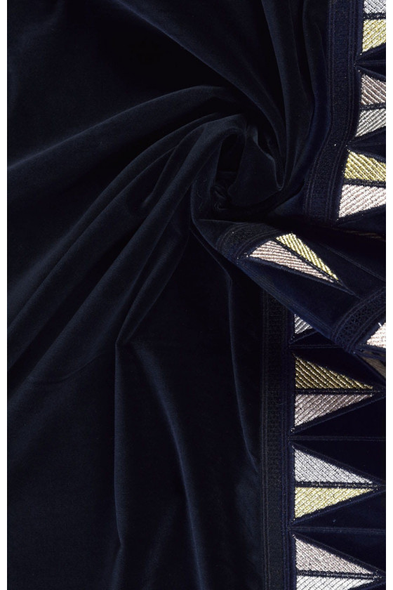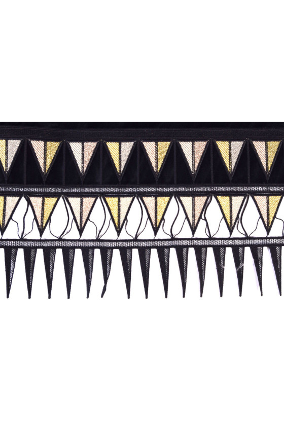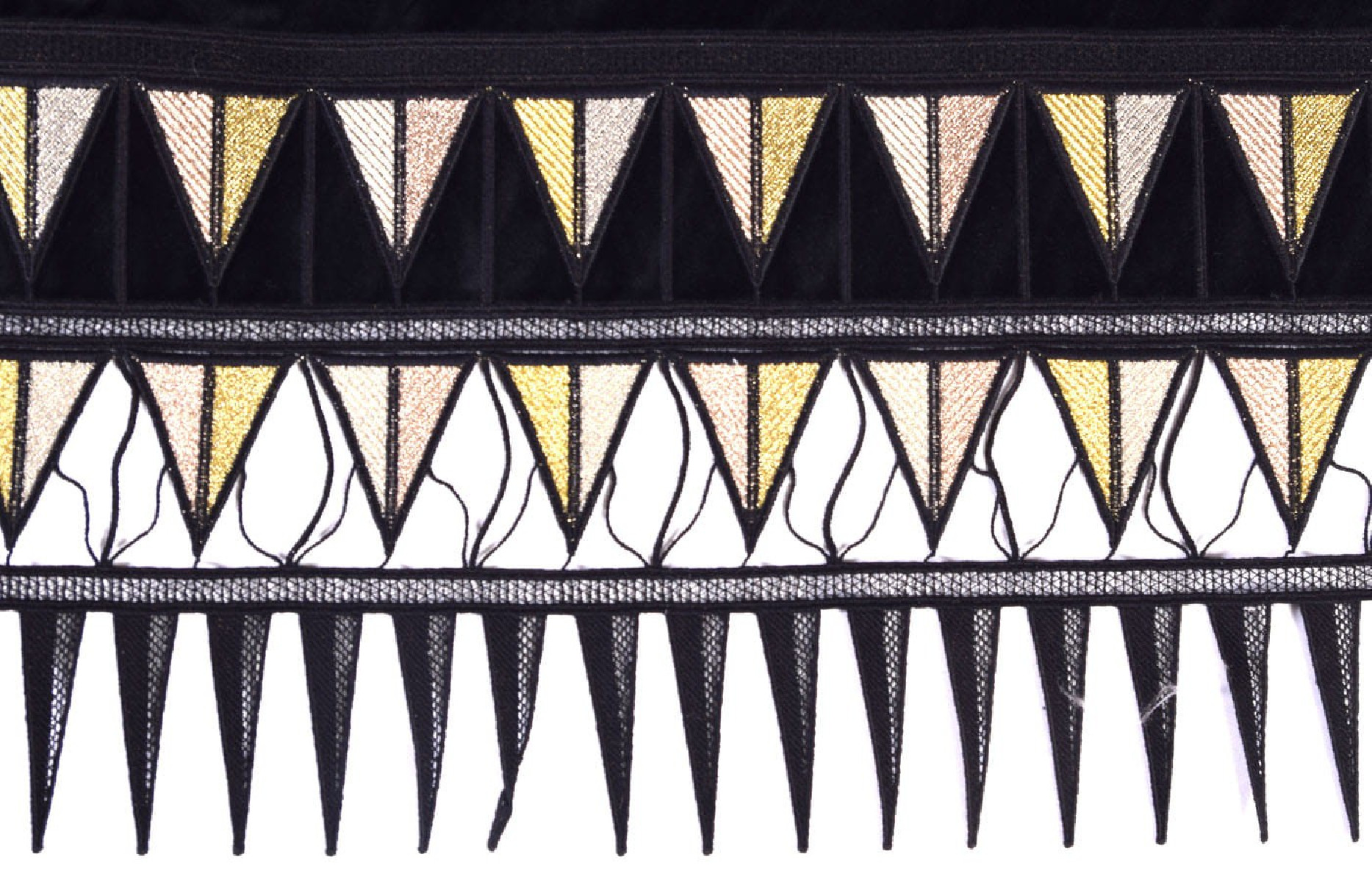 Vacker, lätt elastisk svart sammet med ett dekorativt bälte broderat med guldtrianglar. Tyg producerat för en välkänd modedesigner.