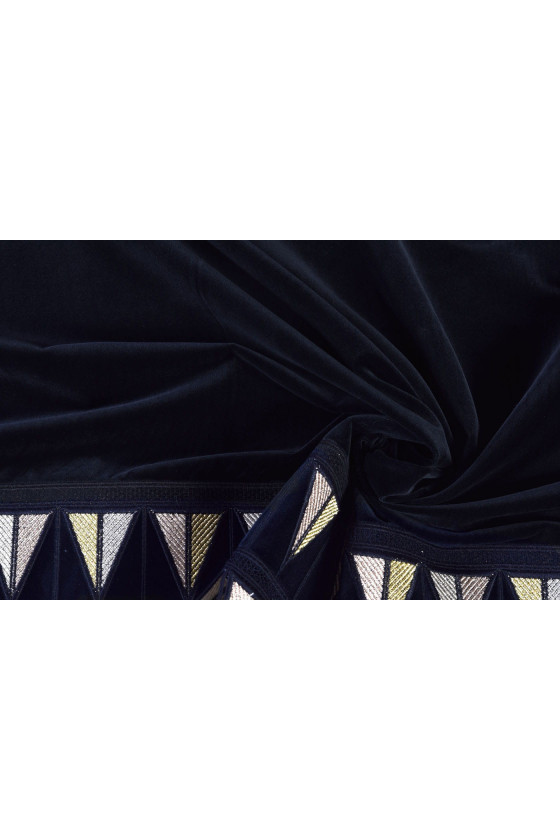 Vacker, lätt elastisk svart sammet med ett dekorativt bälte broderat med guldtrianglar. Tyg producerat för en välkänd modedesigner. Tjockare, ogenomskinligt, elastiskt tyg. Vi rekommenderar den för figursydda klänningar, kjolar, byxor eller jackor.