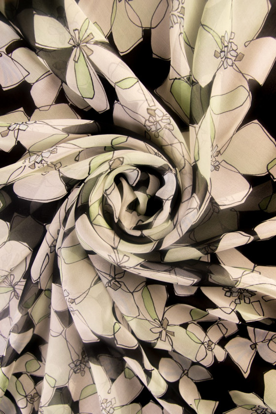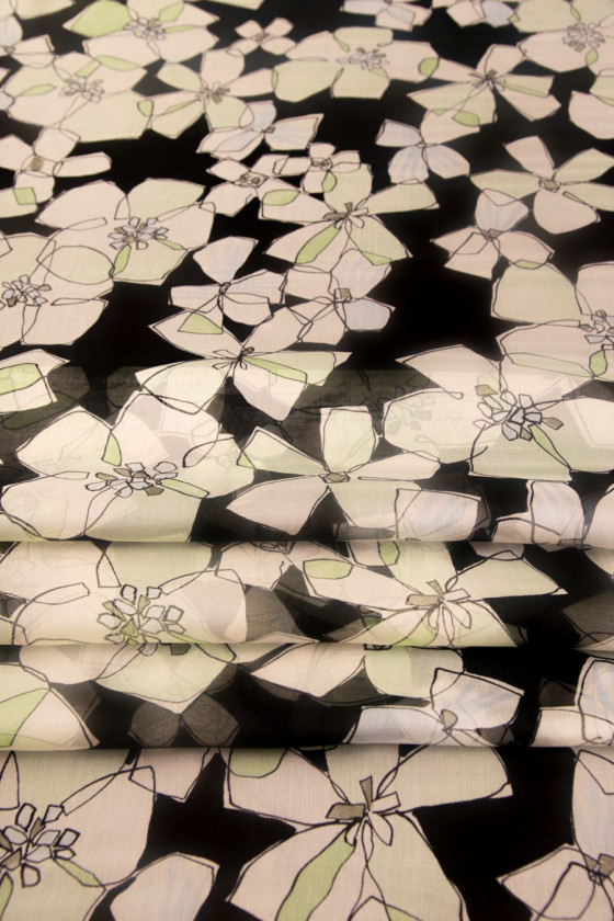 Muslin av naturligt siden, svart färg med grädd-pistageblommor med svarta konturer. Muslin är ett mycket känsligt, luftigt, transparent tyg (kräver foder). Perfekt för luftiga klänningar och blusar. Icke-elastiskt tyg.