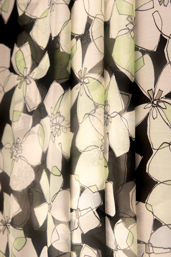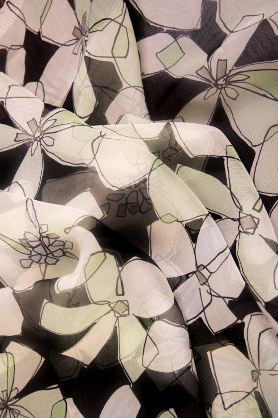 Muslin av naturligt siden, svart färg med grädd-pistageblommor med svarta konturer. Muslin är ett mycket känsligt, luftigt, transparent tyg (kräver foder).