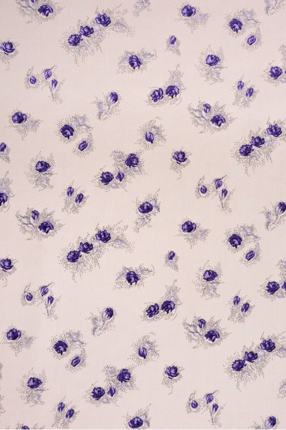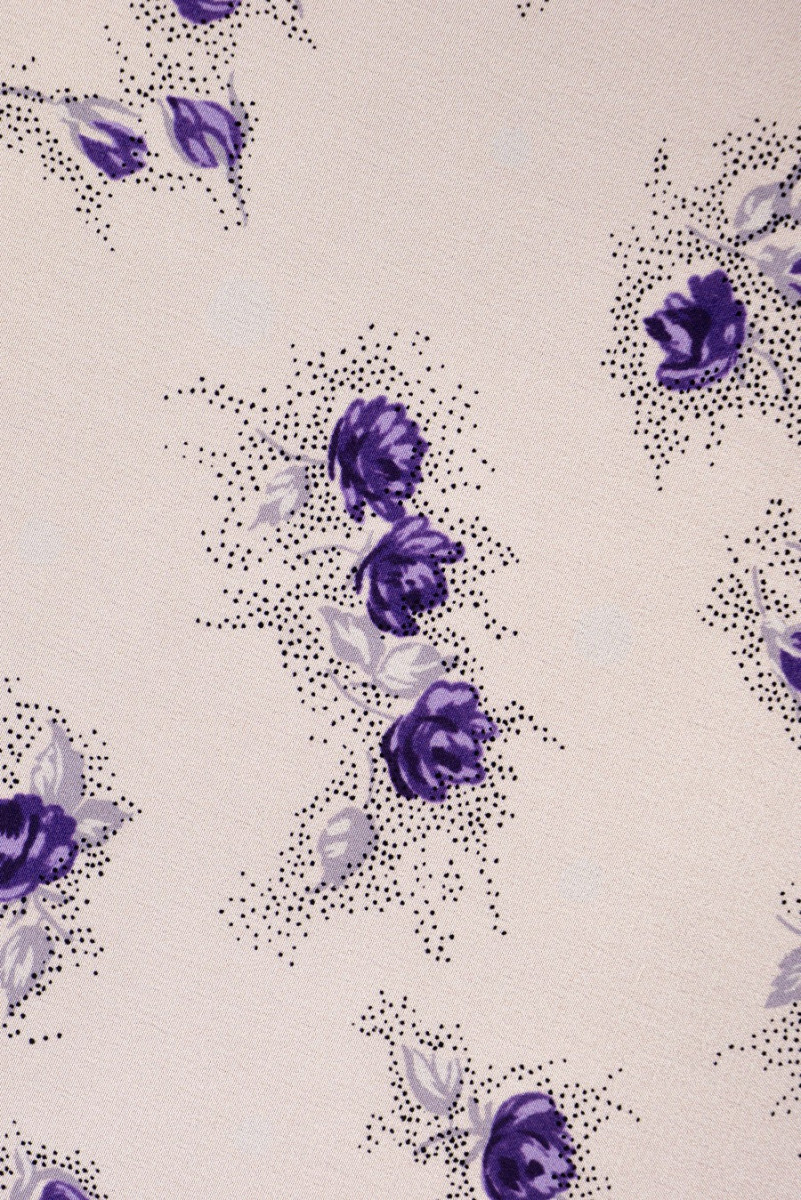 Italiensk 100% sidencrepe med små rosor (ca 2cm) - signerad med namnet på ett välkänt modehus. Sidencrêpe är ett känsligt, tunt, halvmatt tyg. Den kan användas för att trolla fram luftiga klänningar, känsliga blusar, halsdukar, halsdukar. Färger: aprikos bakgrund, lila blommor.