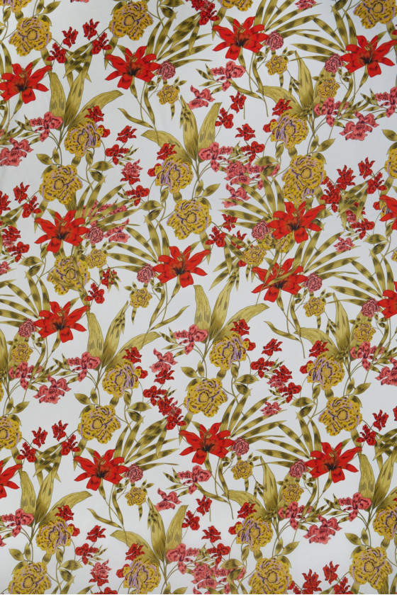 Italiensk sidencrêpe med röda och gula blommor på en grågrön bakgrund, det hela kompletteras av olivblad. Sidencrêpe är ett känsligt, tunt, halvmatt tyg. Den kan användas för att trolla fram luftiga klänningar, känsliga blusar, halsdukar, halsdukar.