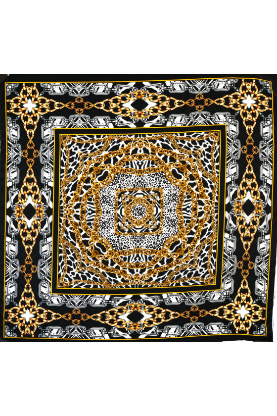 Italiensk 100% sidencrêpe i en kupong med måtten 130 cm* 140 cm. Tyg med ett intressant motiv av guld- och silverkedjor och leopardmönster i grå grafit. Mönstret kommer från det välkända italienska modehusets kollektion.