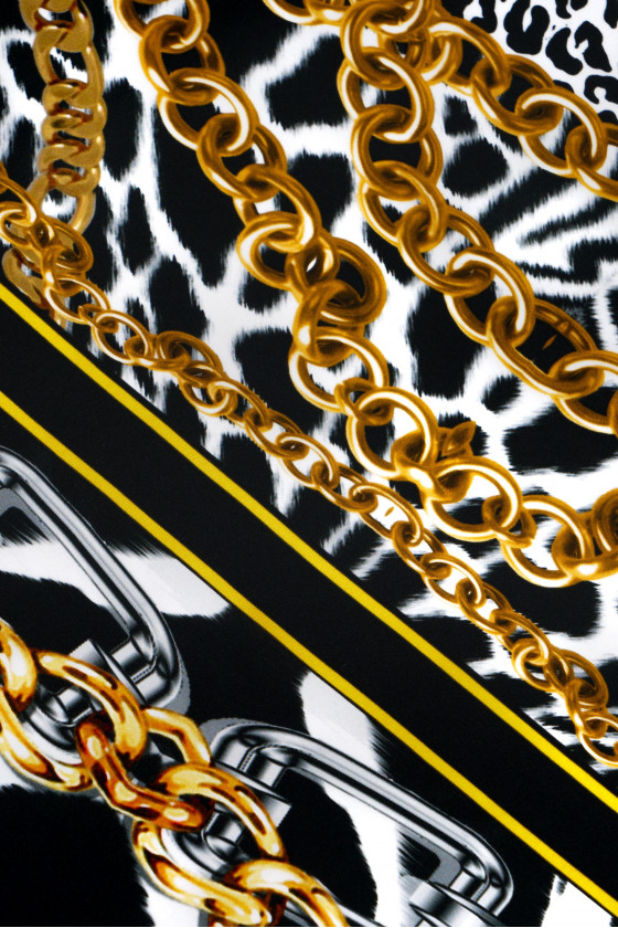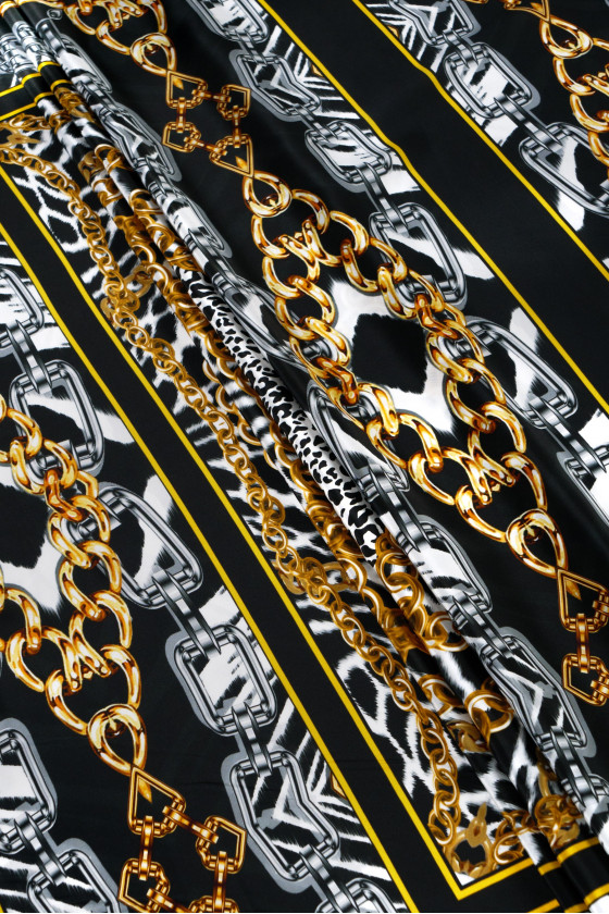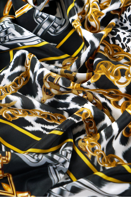 Italiensk 100% sidencrêpe i en kupong med måtten 130 cm* 140 cm. Tyg med ett intressant motiv av guld- och silverkedjor och leopardmönster i grå grafit. Mönstret kommer från det välkända italienska modehusets kollektion. Sidencrêpe är ett känsligt, tunt, halvmatt tyg. Den kan användas för att trolla fram luftiga klänningar, känsliga blusar, halsdukar, halsdukar.