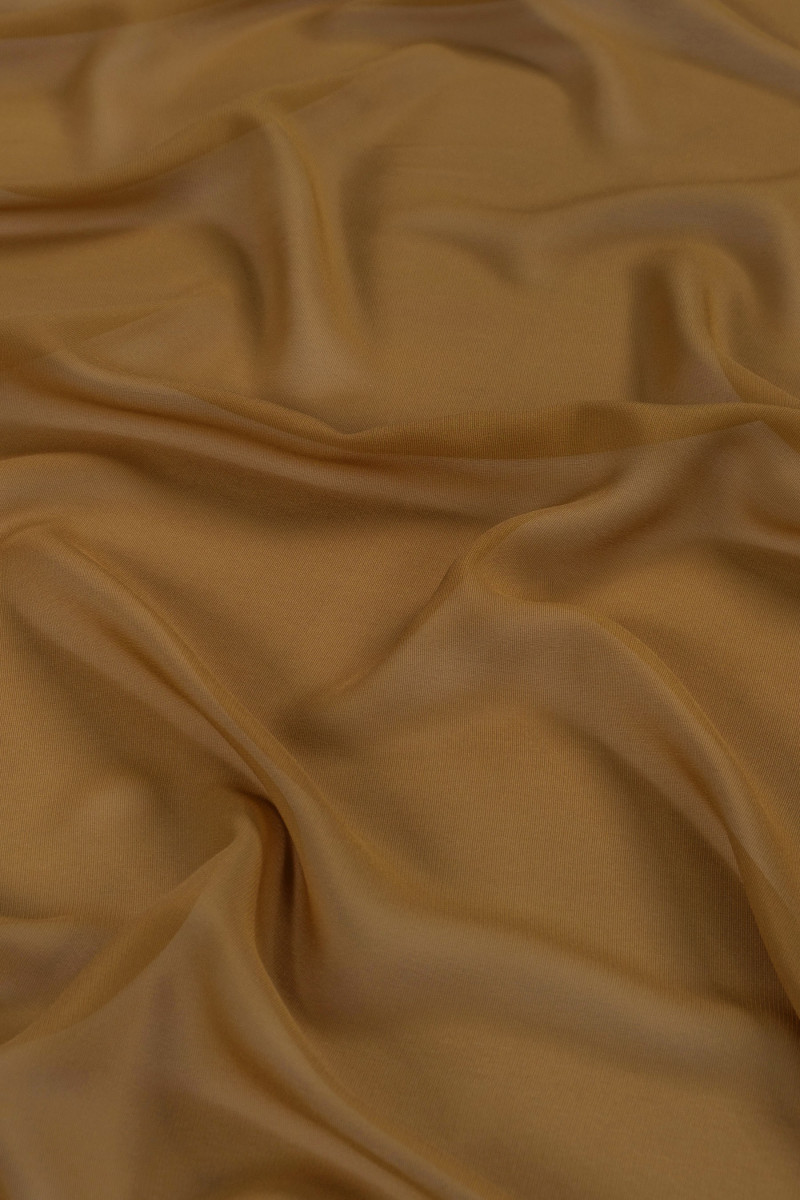 Italienskt, tunt tyg med georgetteväv i färgen gammalt guld. Georgette är ett tyg med en lös tuskaftsväv av tvinnade trådar, vilket ger det en karakteristisk grov yta. Det är ett luftigt och delikat material, transparent, det passar på ett vackert, flytande sätt. Perfekt för att sy en blus, klänning, kjol eller sjal.