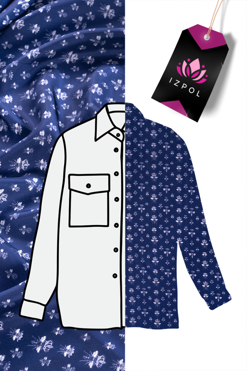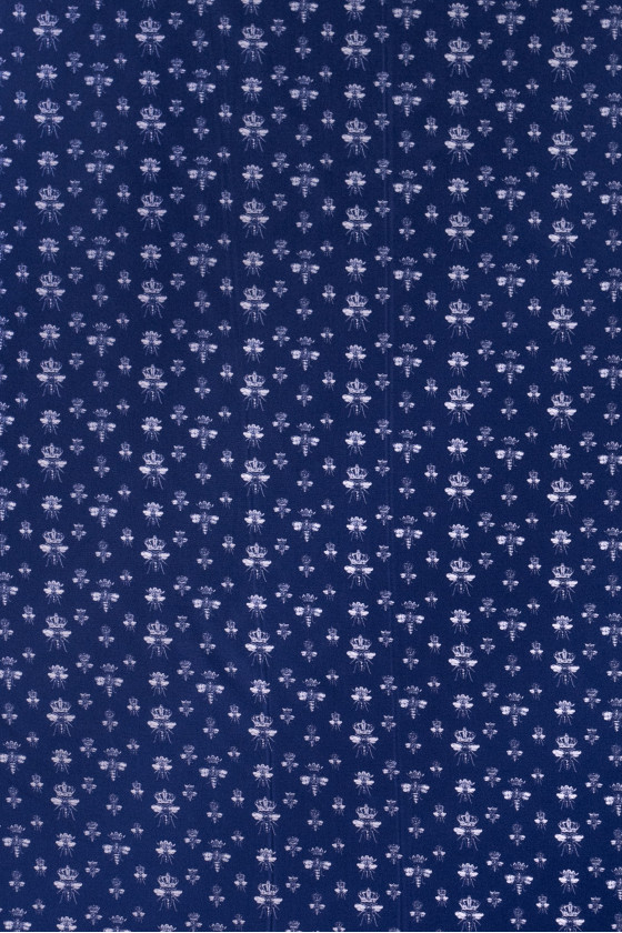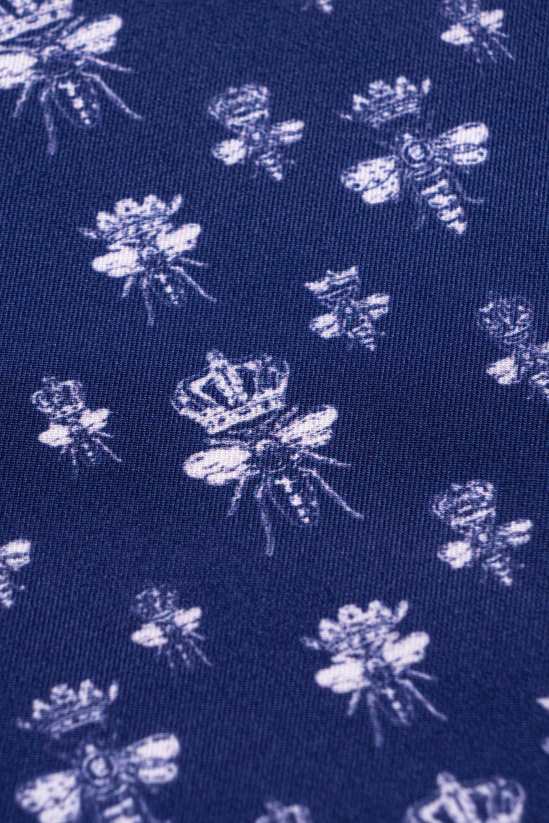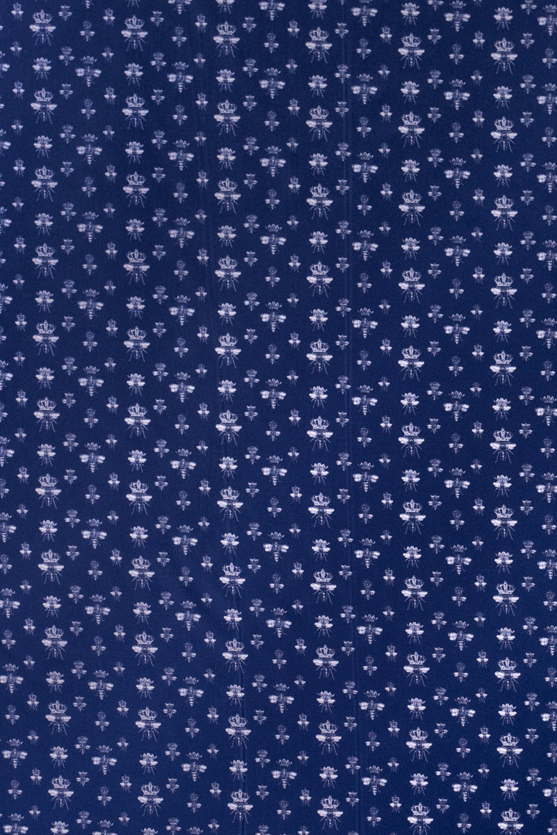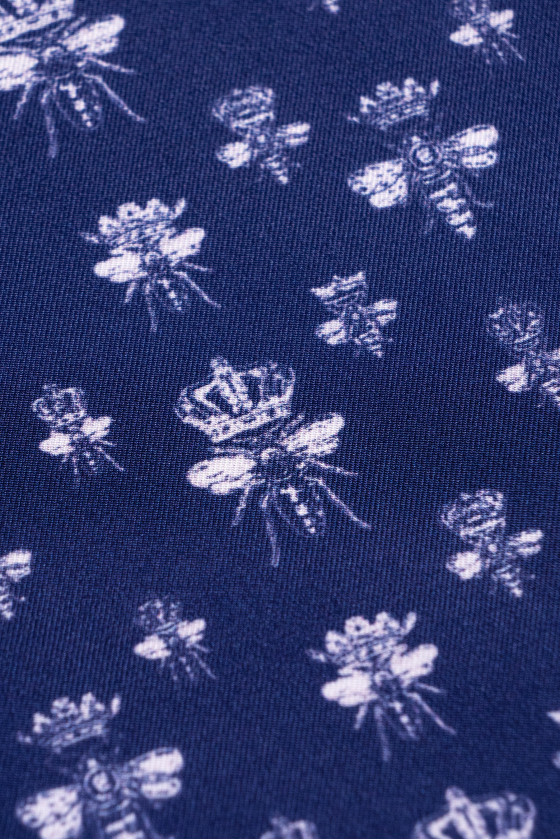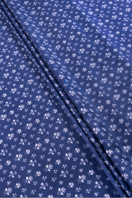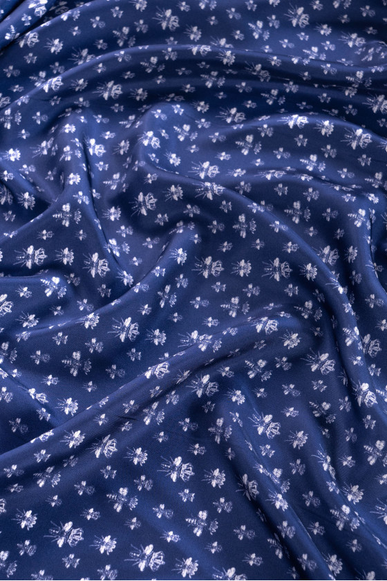 Italienskt 100% sidentwilltyg i marinblått med ett motiv av små flugor i vitt. Sidentwill är ett tyg med kypertväv, mjukt, mycket slitstarkt, försiktigt styvt att passa. Perfekt för att sy skjorta, klänning, kjol eller sjal/halsduk.