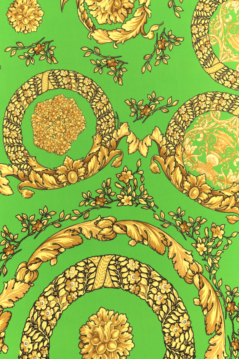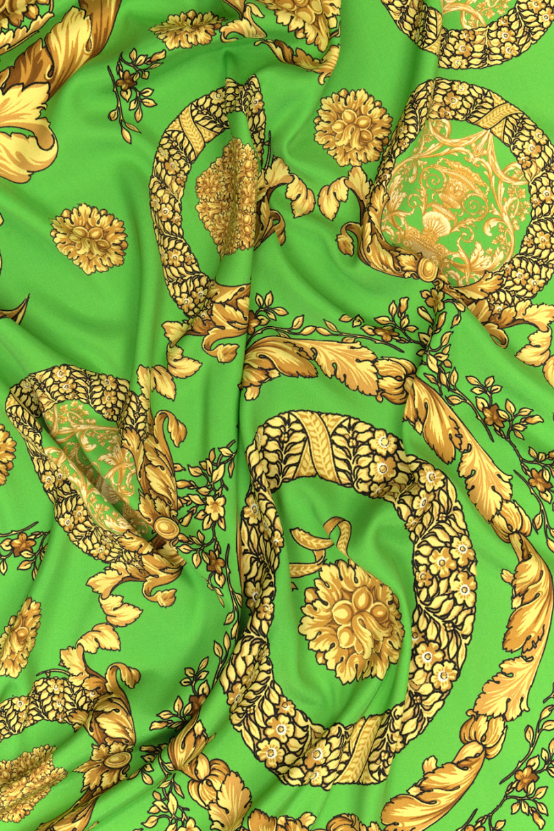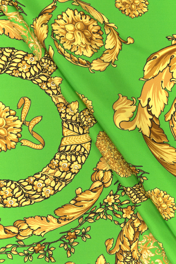 Italiensk sidensatin med tillsats av elastan med ett tryck gjort på en matt sida. Ett vackert, tätt motiv av gyllene ornament som är arrangerade i runda mönster. Längs båda kanterna avslutas tyget med dekorativa bårder 5 cm breda och runda motiv som bildar vertikala ränder. Det hela är tryckt på en vacker grön bakgrund. Det är ett mycket mångsidigt tyg, det kan sys både vertikalt och horisontellt. Tillsatsen av elastan gör den bekvämare att bära och skrynklar mindre. Den är perfekt för att sy en originell skjorta, klänning eller kjol.