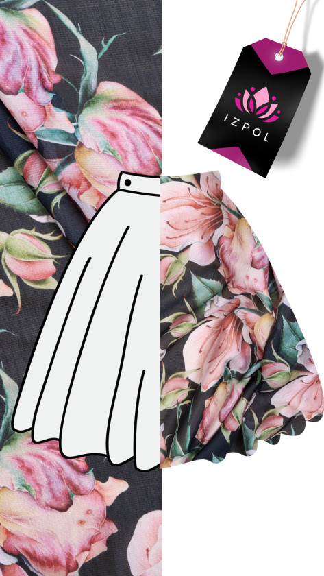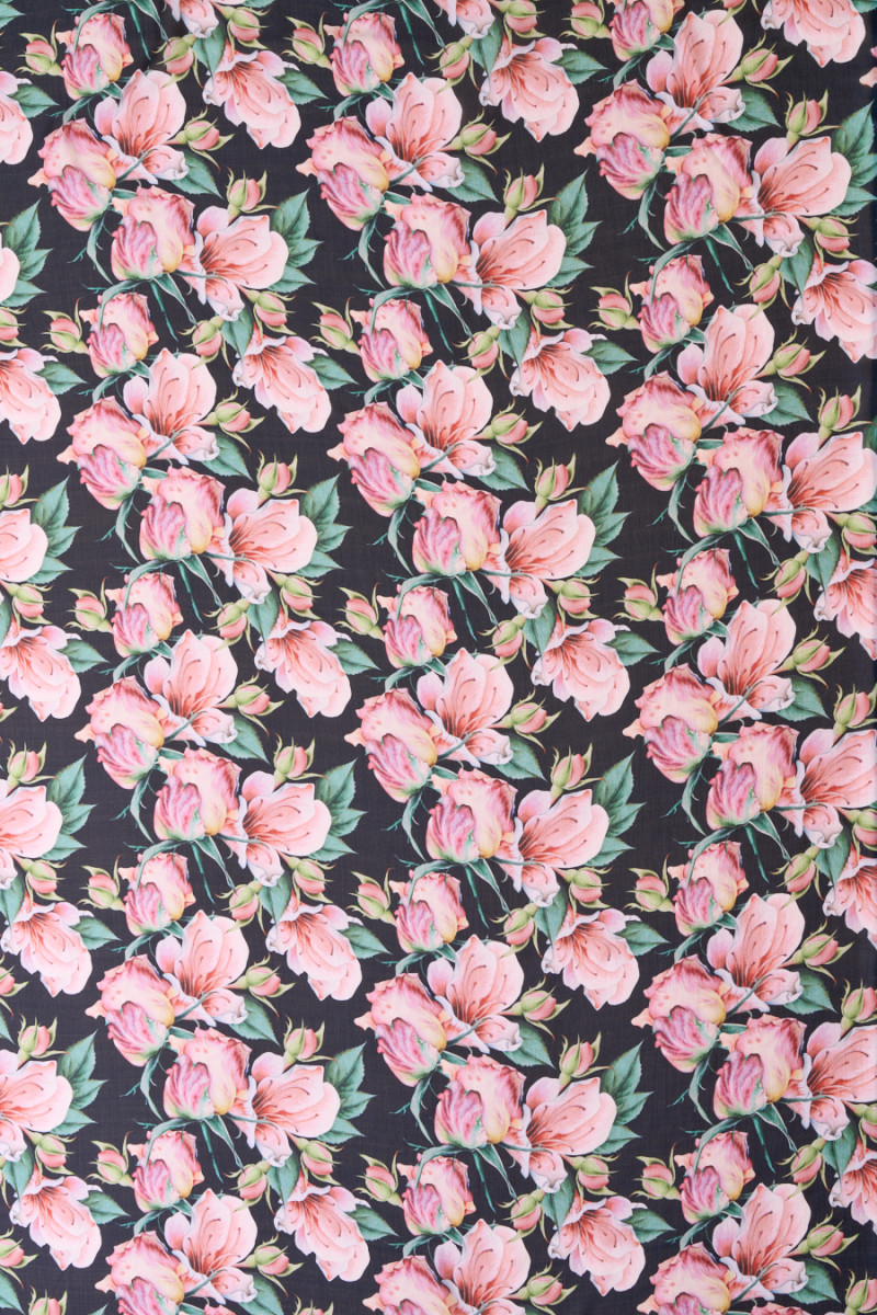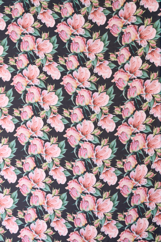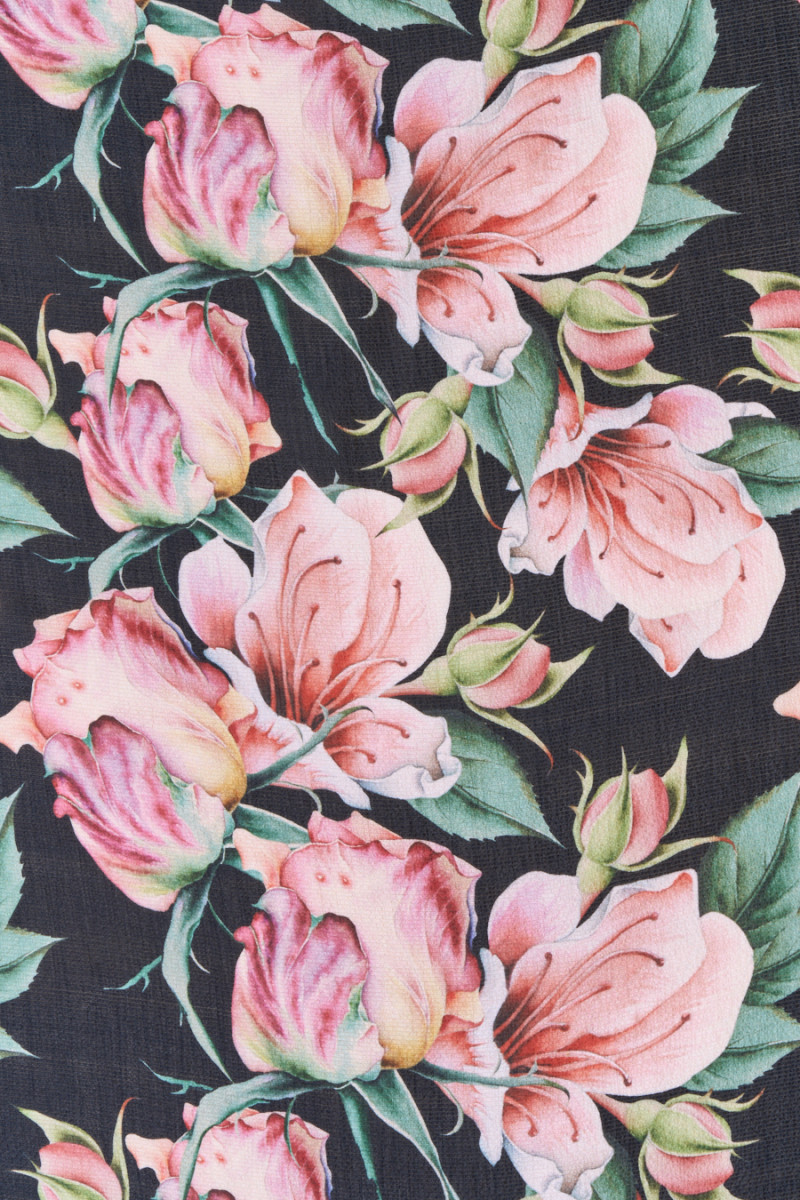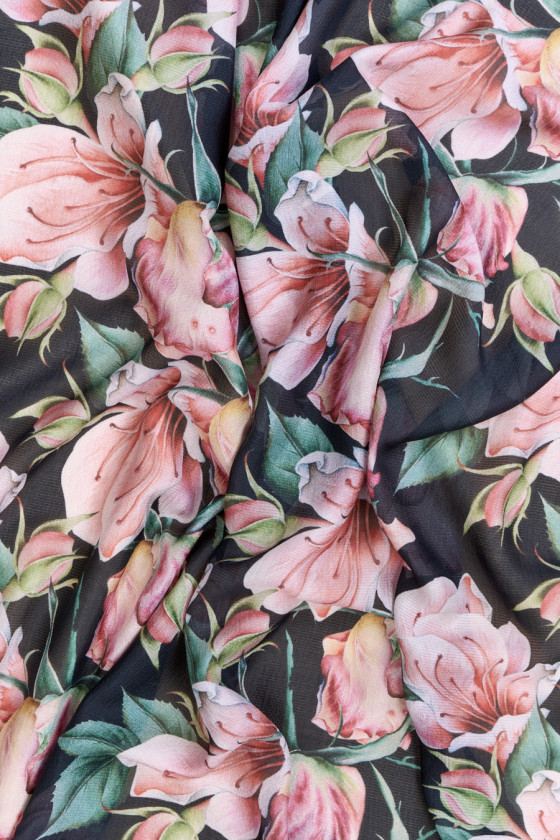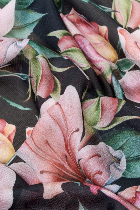 Italiensk chiffong 100% siden med stora, skuggade blommor i rosa på svart botten. Tyget är tillverkat med en mycket delikat randig struktur, tätt arrangerade blommor från 10 cm till 14 cm breda och samma längd, dessutom dekorerade med gröna blad. Tyget är lätt, luftigt, lätt transparent, icke-elastiskt. Ett vackert förslag för att skapa en unik klänning, blus eller kjol.