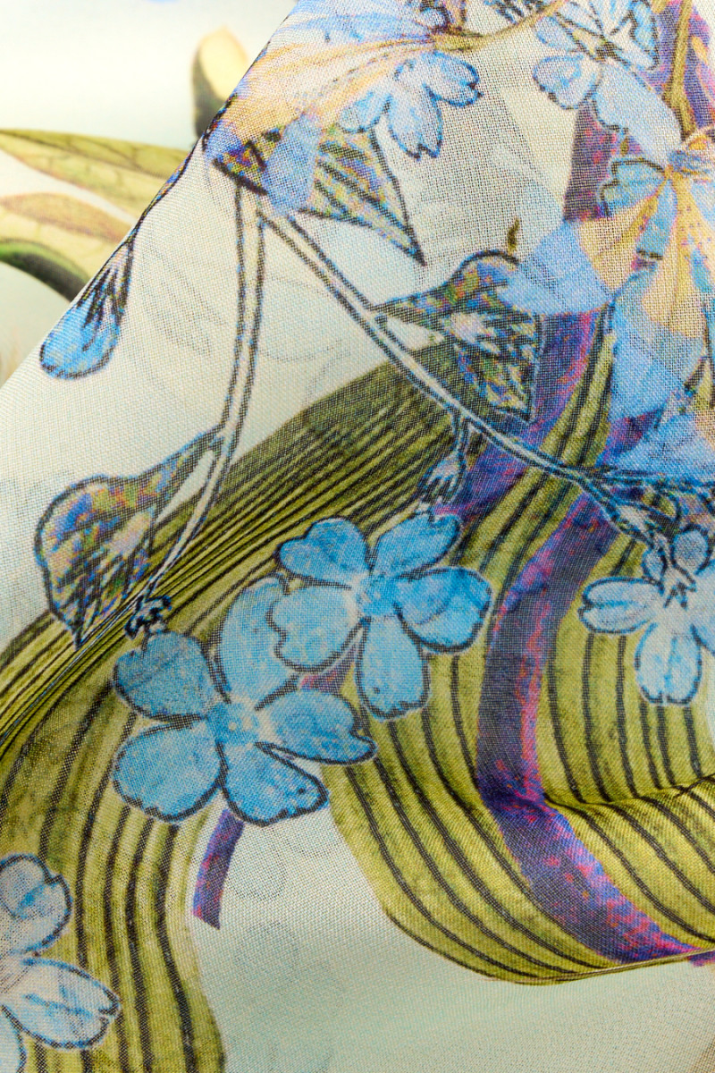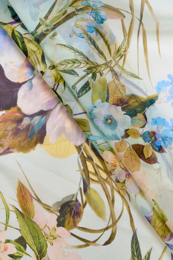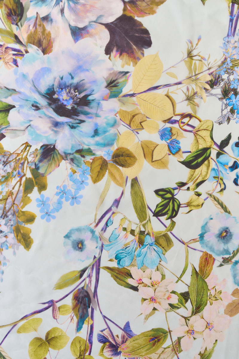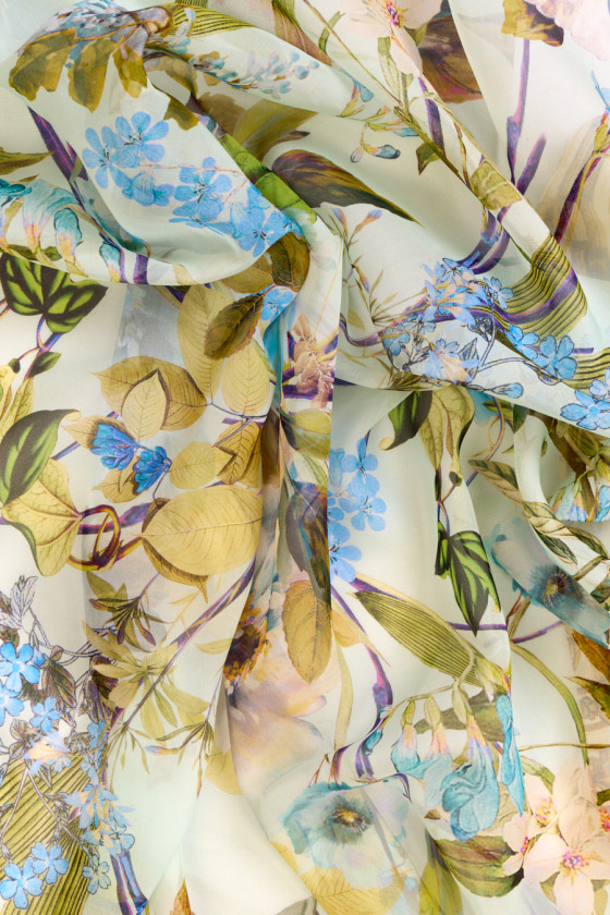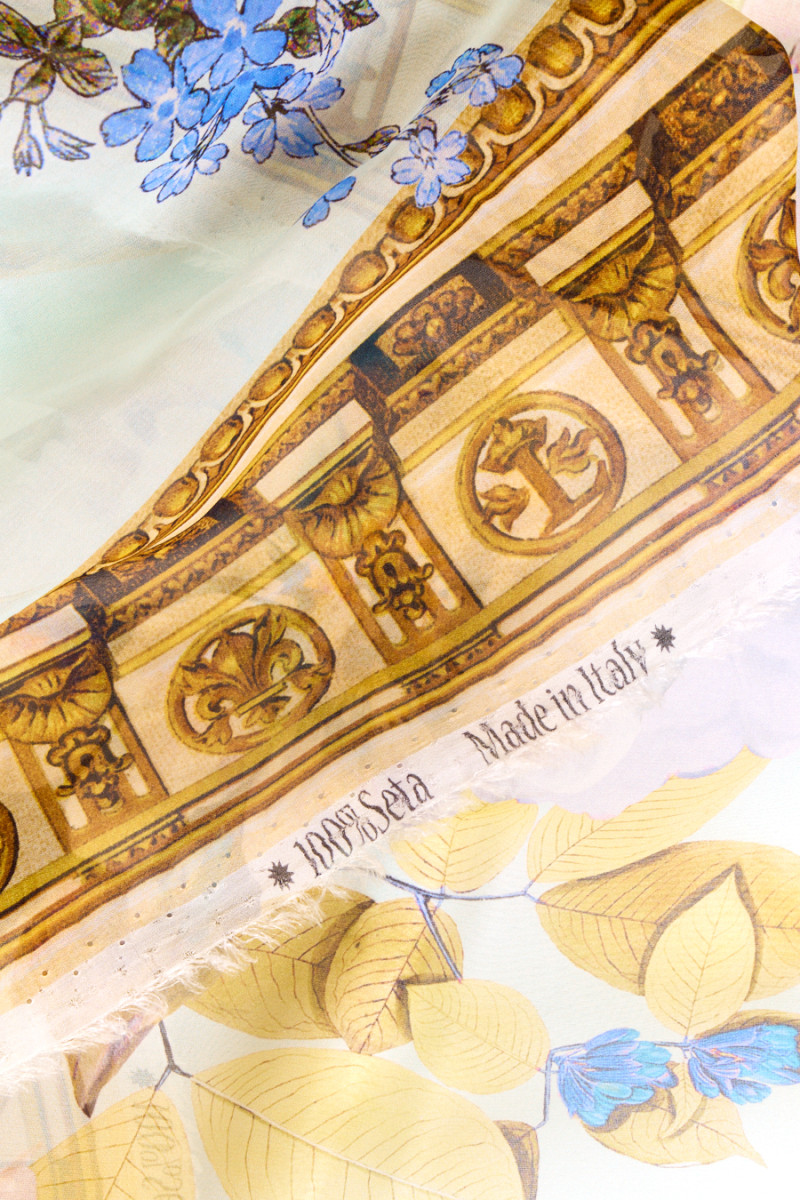 Italiensk 100% sidenmuslin med ett motiv av blå och gräddvita blommor på en ljusblå bakgrund i en vackert dekorerad ram, vilket ger tyget elegans. Tyget kommer i kuponger med måtten 140cm*140cm. Naturlig sidenmuslin är ett mycket känsligt, luftigt, transparent tyg med en delikat glans som är karakteristisk för sidentyger. Perfekt för lätta klänningar, blusar, kjolar.