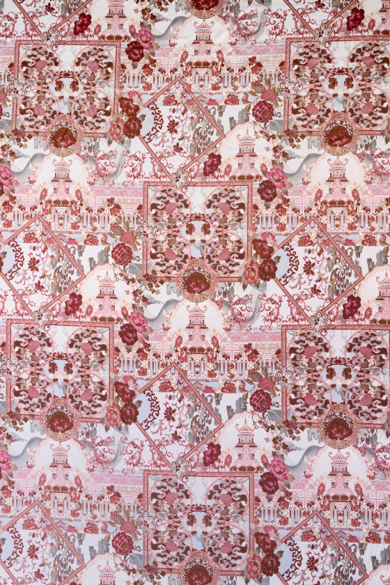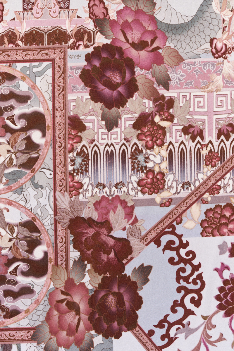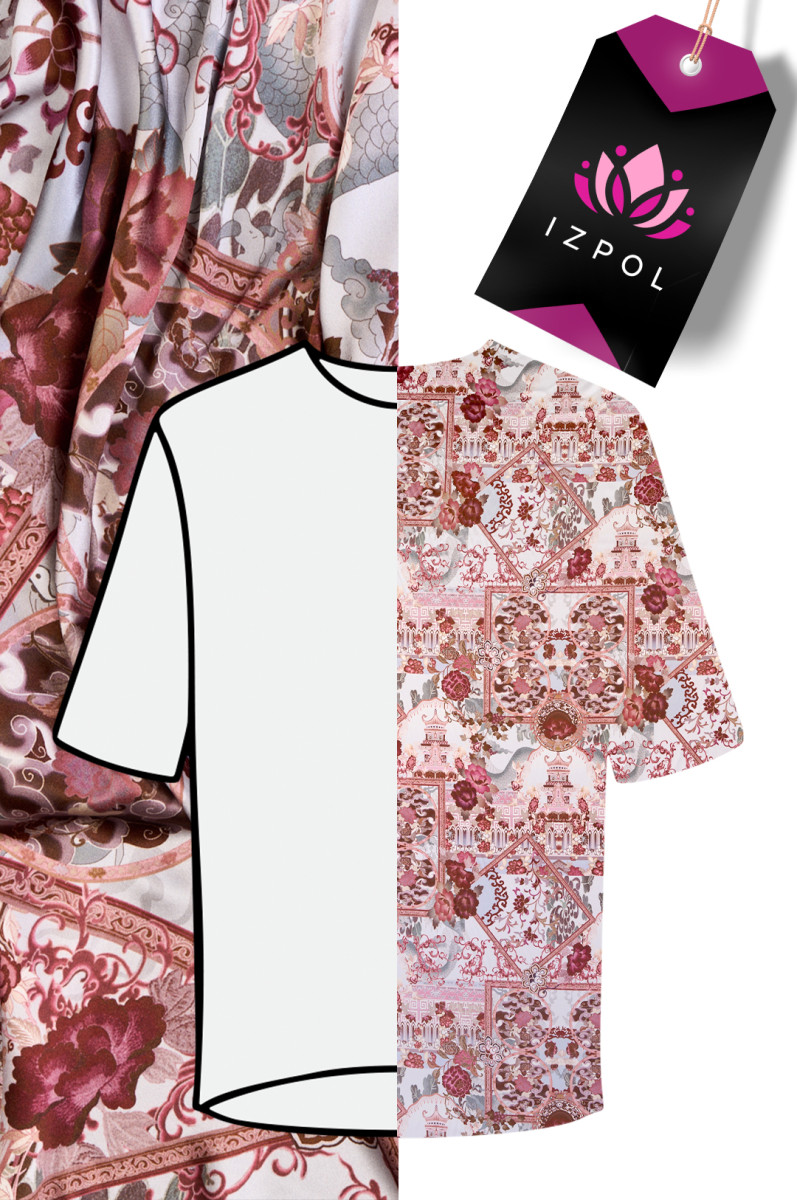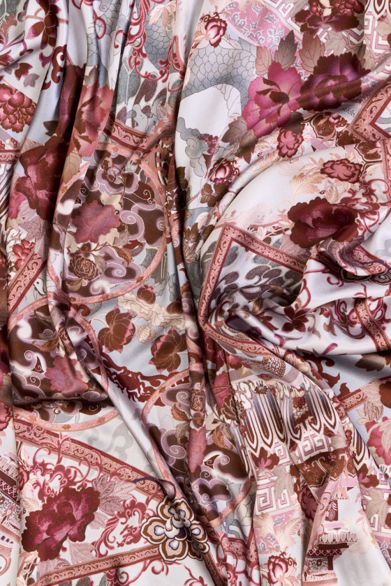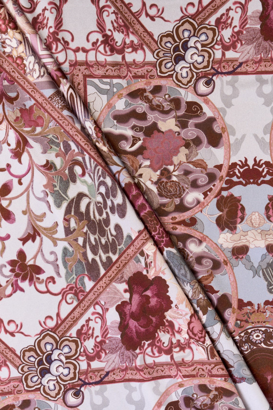 Italiensk sidensatin med tillägg av elastan med kinesiska motiv på en grå och gräddvit bakgrund. Det täta mönstret i nyanser av brunt och vinrött visar kinesiska byggnader, blommor och drakar, samt fyrkantiga och runda ramar som kompletterar hela grafiken. Sidensatin är ett tätt och lätt tyg med en plan yta, tillsatsen av elastan gör det bekvämare att bära och skrynklar mindre. Den är perfekt för att sy en originell skjorta, klänning, kjol och luftig kimono.