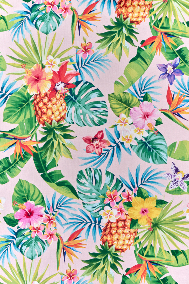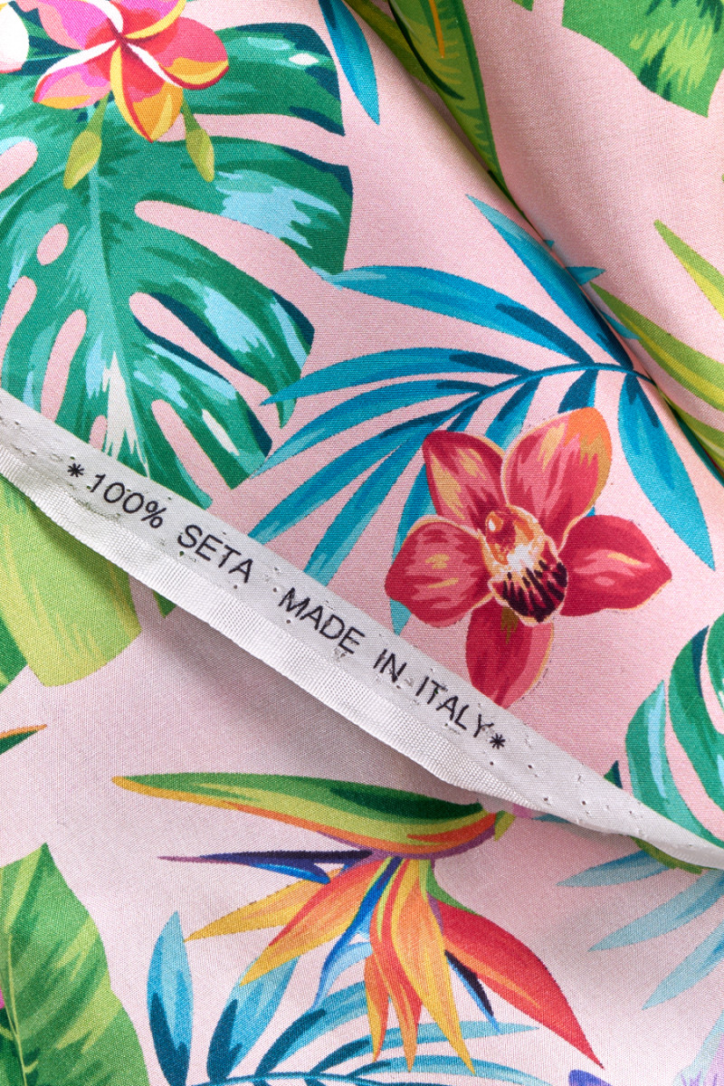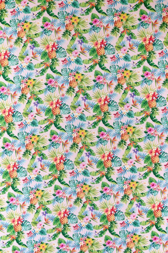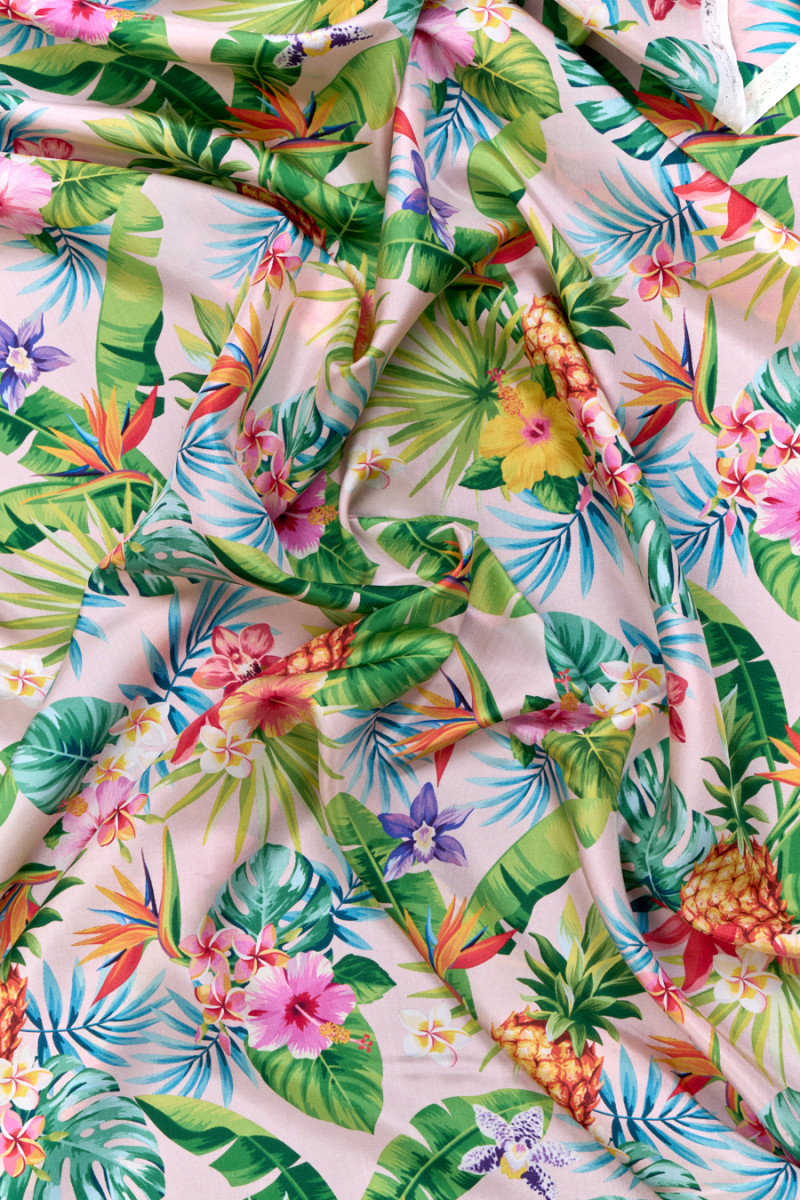 Italiensk habotai 100% siden med tropiska, färgglada mönster på en ljusrosa bakgrund. Täta blad-, blom- och ananasmotiv i fräscha sommarfärger. Tyget är mycket lätt, luftigt, icke-elastiskt, färdigt med en mycket delikat glans. Ett glatt och lätt förslag som kommer att vara perfekt för att sy en blus, skjorta, klänning eller tunika.