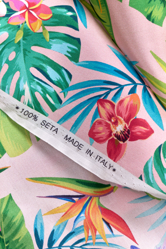 Italiensk habotai 100% siden med tropiska färgglada mönster på en ljusrosa bakgrund. Täta motiv av blad, blommor och ananas i fräscha, somriga färger. Tyget är mycket lätt, luftigt, oelastiskt, färdigt med en mycket delikat glans. Ett glatt och lätt förslag som kommer att vara perfekt för att sy en blus, skjorta, klänning eller tunika.