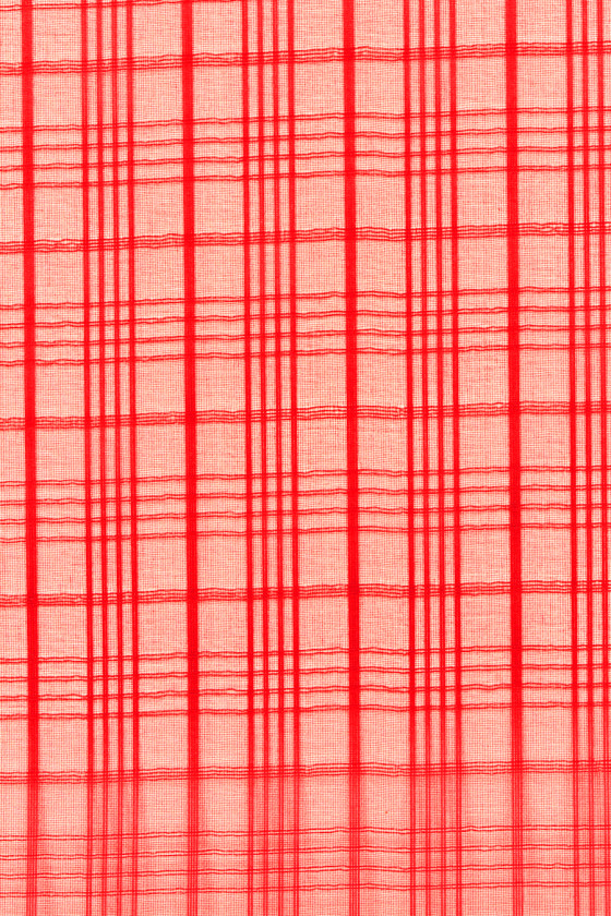Italiensk organza 100% siden i rött med ett motiv av regelbundet placerade ränder som bildar ett rutigt mönster som upprepas var 2,5 cm. Tyget är genomskinligt, något styvt och inte elastiskt. Tyg avsett för klänningar, blusar, skjortor, kjolar.