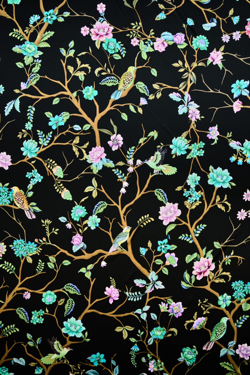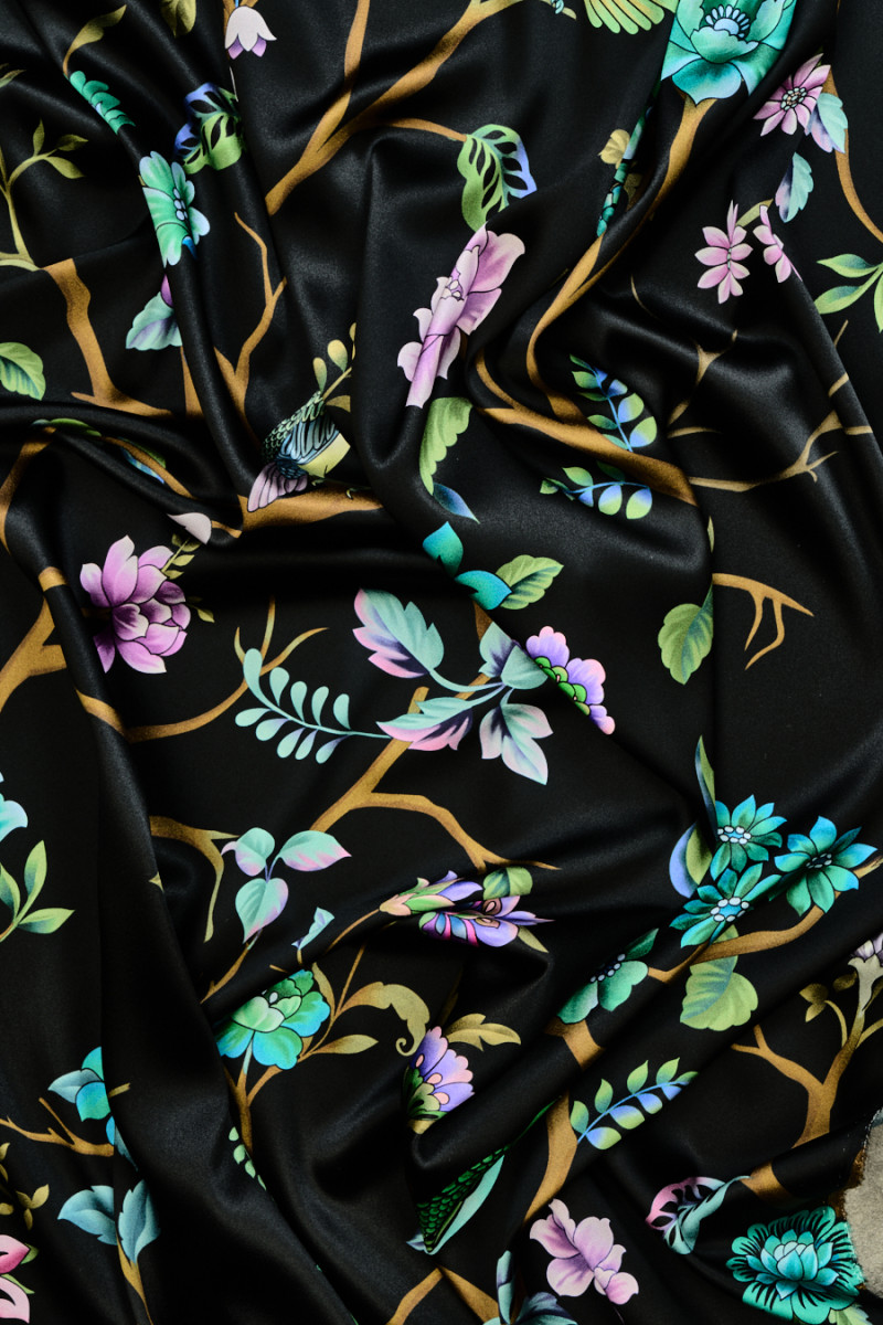 Italiensk sidensatin med tillsats av elastan med ett ganska tätt motiv av bruna grenar dekorerade med färgglada blommor och fåglar på en svart bakgrund. Blommor och fåglar gjorda i energiska nyanser av turkos, grönt och lila. Tyget är flytande, mjukt, elastiskt och vackert glänsande, vilket ger det en unik elegans. Den är perfekt för luftiga klänningar, kjolar, såväl som blusar och skjortor.