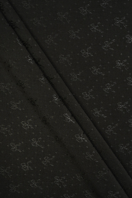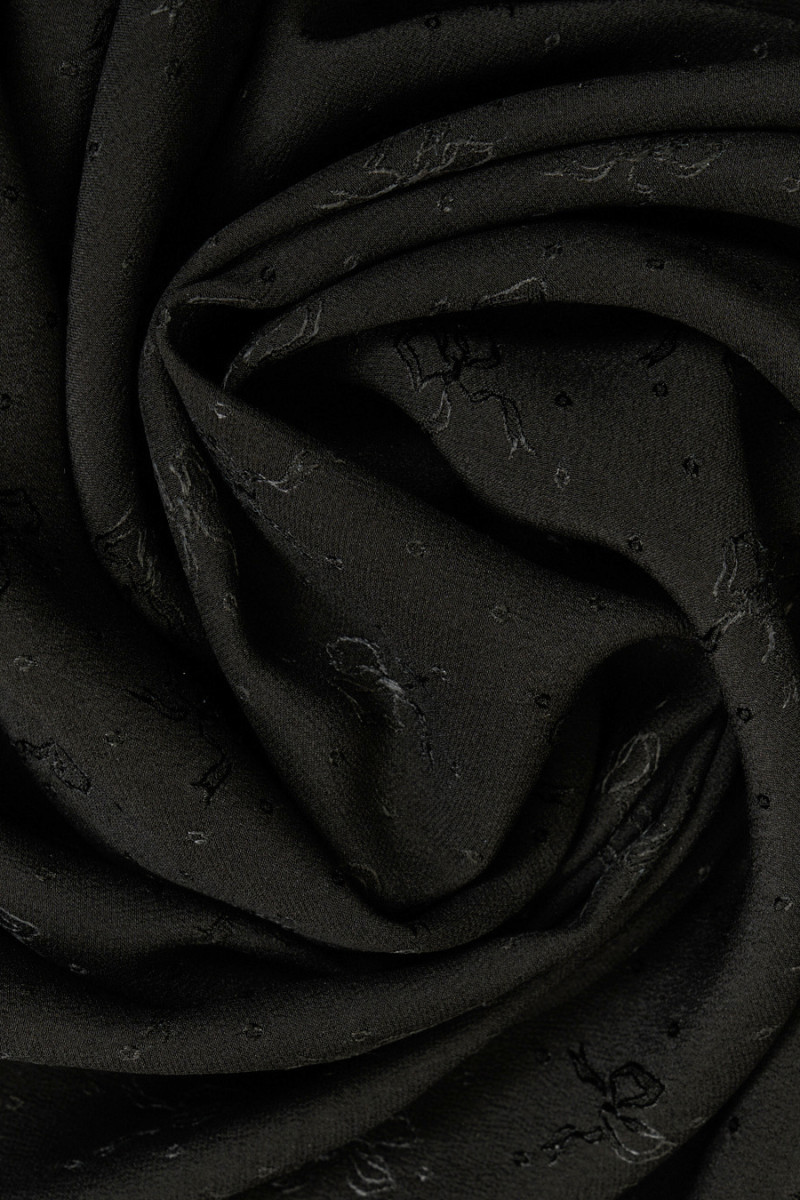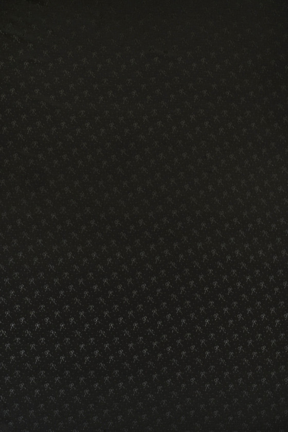 Italienskt sidentyg i svart. Tyget har en tät strukturell väv med ett tätt mönster av rosetter (2 cm) och små prickar. Den är tunn men ogenomskinlig, luftig och elastisk. Ett fantastiskt förslag för att sy en ljus blus, skjorta eller klänning. Om du gillar ädla tyger i en tidlös färg är det här tyget just för dig.