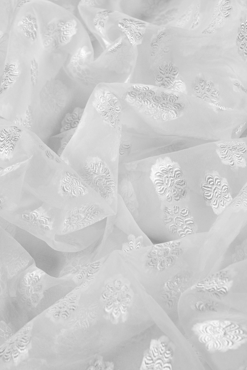 Italienskt organzatyg i siden-polyester med påsydda krämfärgade blommor.
