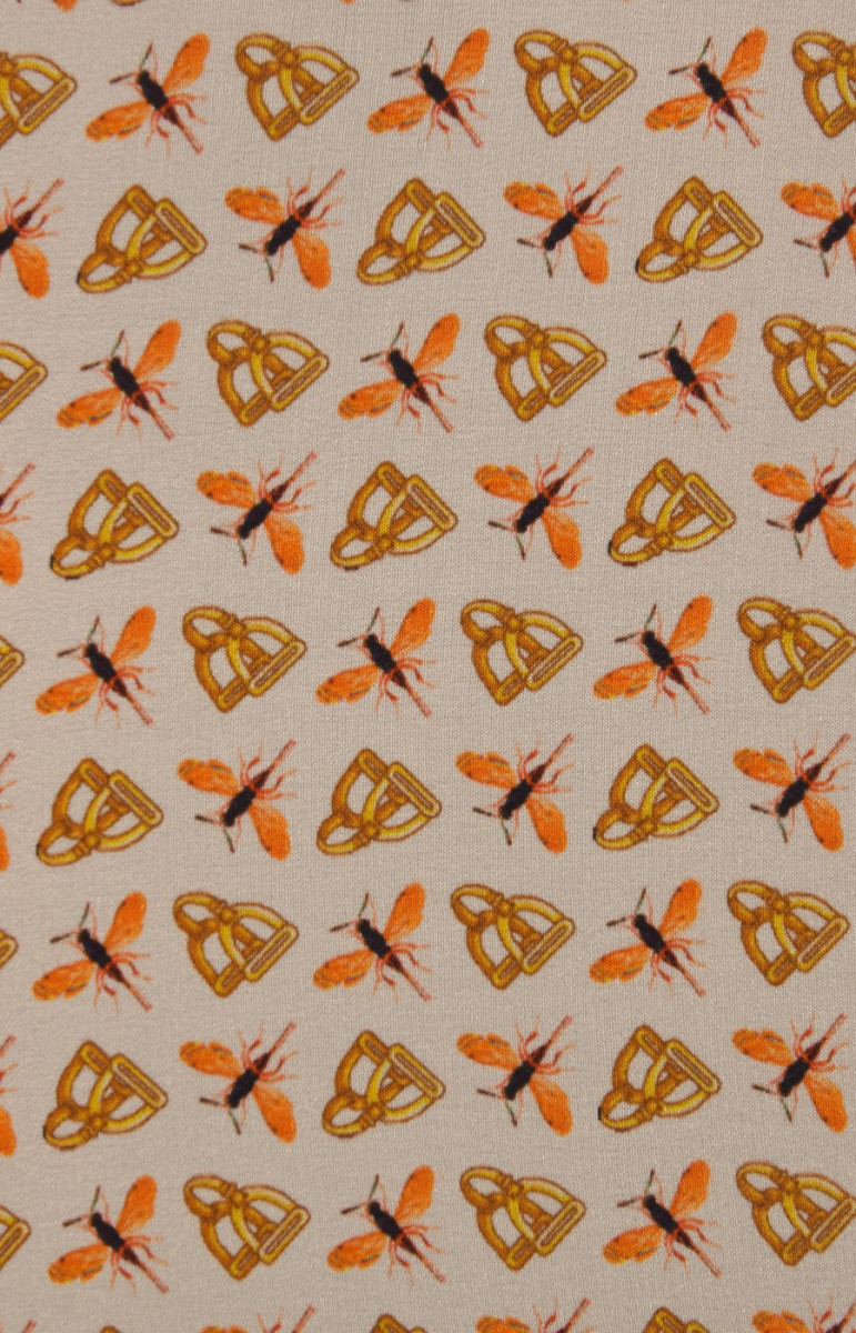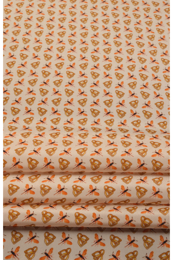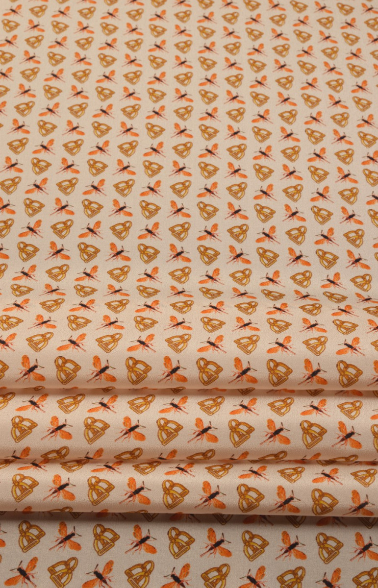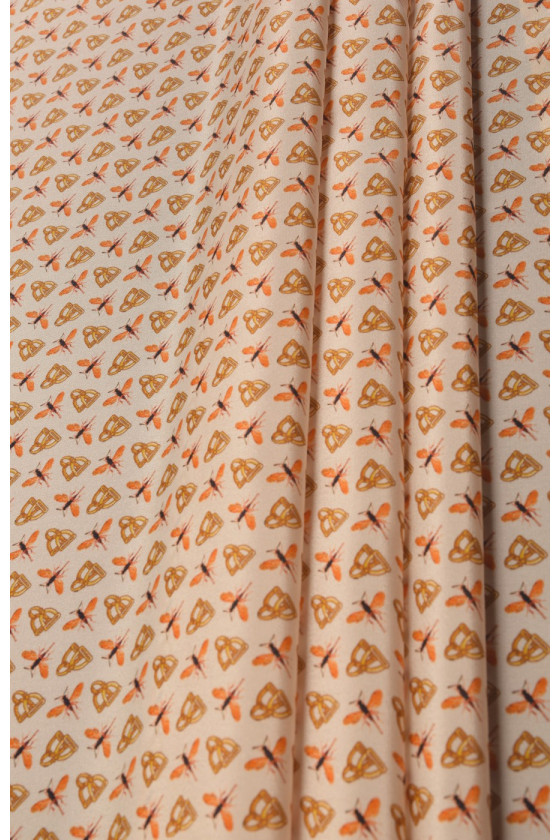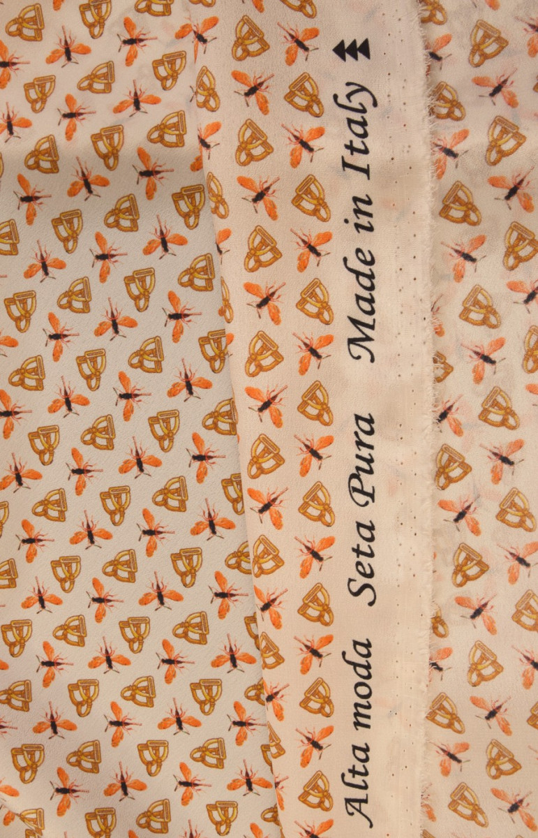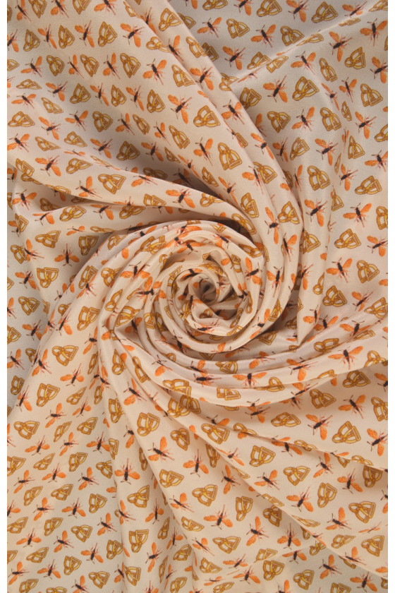 Sidencrêpe är ett känsligt, tunt men ogenomskinligt, halvmatt tyg. Den kan användas för att trolla fram luftiga klänningar, känsliga blusar, halsdukar, halsdukar. Ett roligt, finstilt tryck av insekter och stigbyglar.