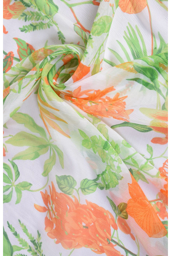 Vackert mönster på naturligt siden. Chiffong är ett mycket känsligt och luftigt tyg. Något genomskinlig. Perfekt för luftiga sommarklänningar. Vi rekommenderar att du förkrymper tyget innan du syr.