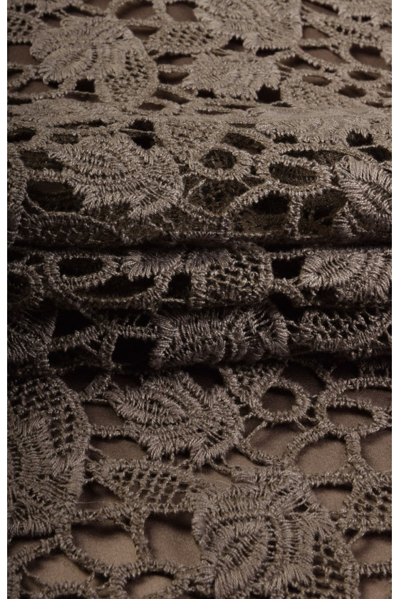 Den sista kupongen av guipure spets i jordbrun färg. På båda sidor avslutas den med en dekorativ tand med ett blommigt motiv. Perfekt för att sy en blus eller kjol.