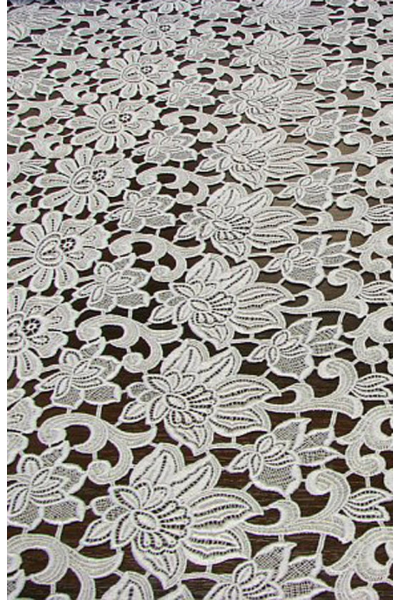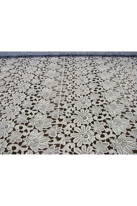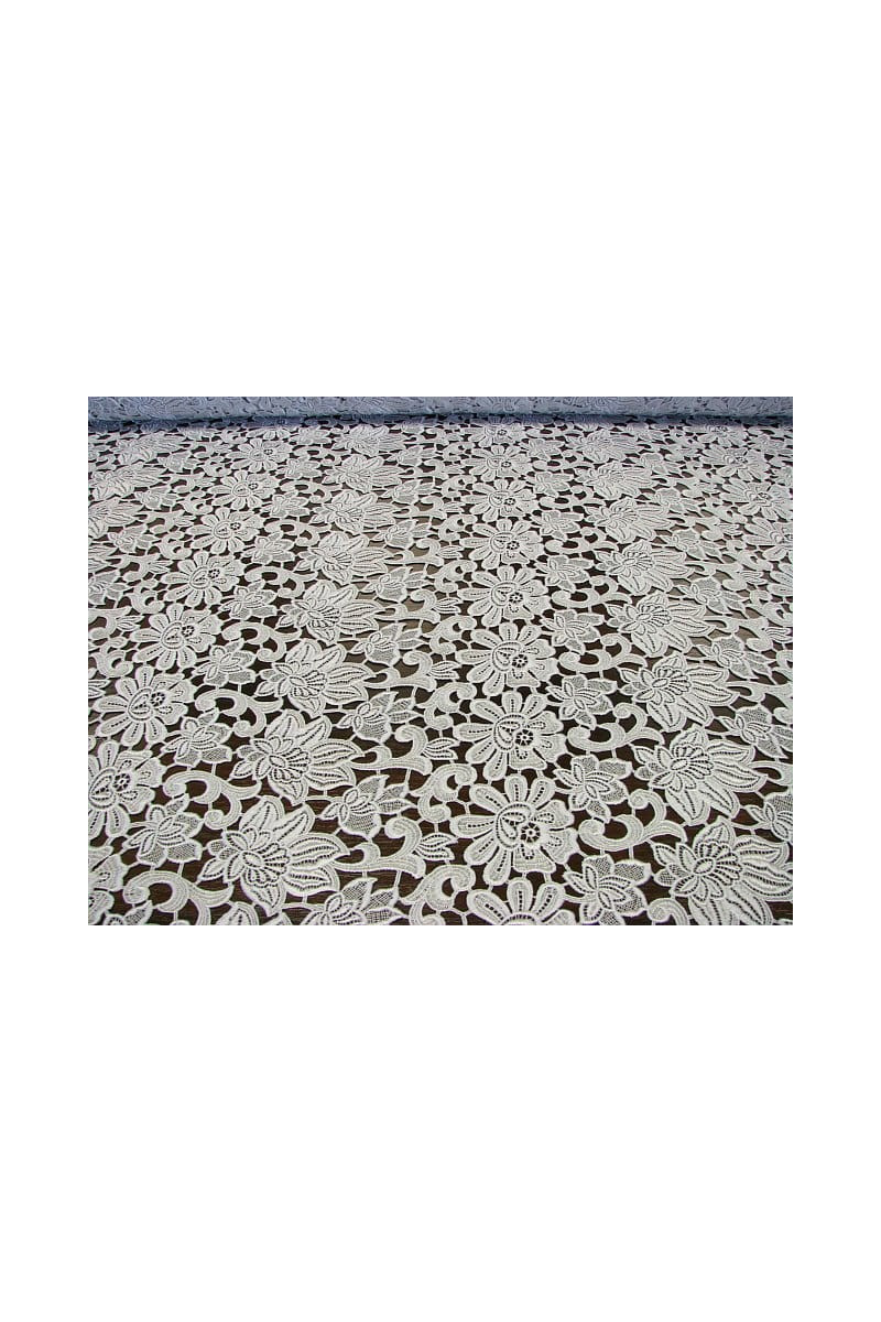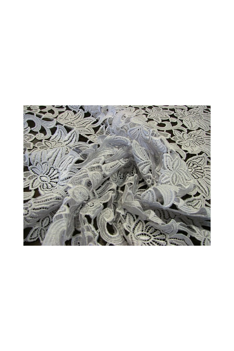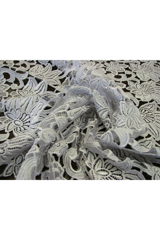 Italienskt guipure-tyg i ljusgrått i en kupong som mäter 160 cm* 125 cm. Ett vackert, tätt blommigt mönster, tyget avslutas med en dekorativ tand på två sidor. Tyget är perfekt för personer som gillar kalla men subtila färger. Den är perfekt för att sy en elegant klänning, blus, kjol eller som avslutning på andra tyger.