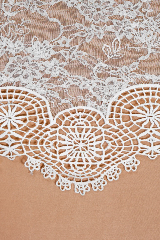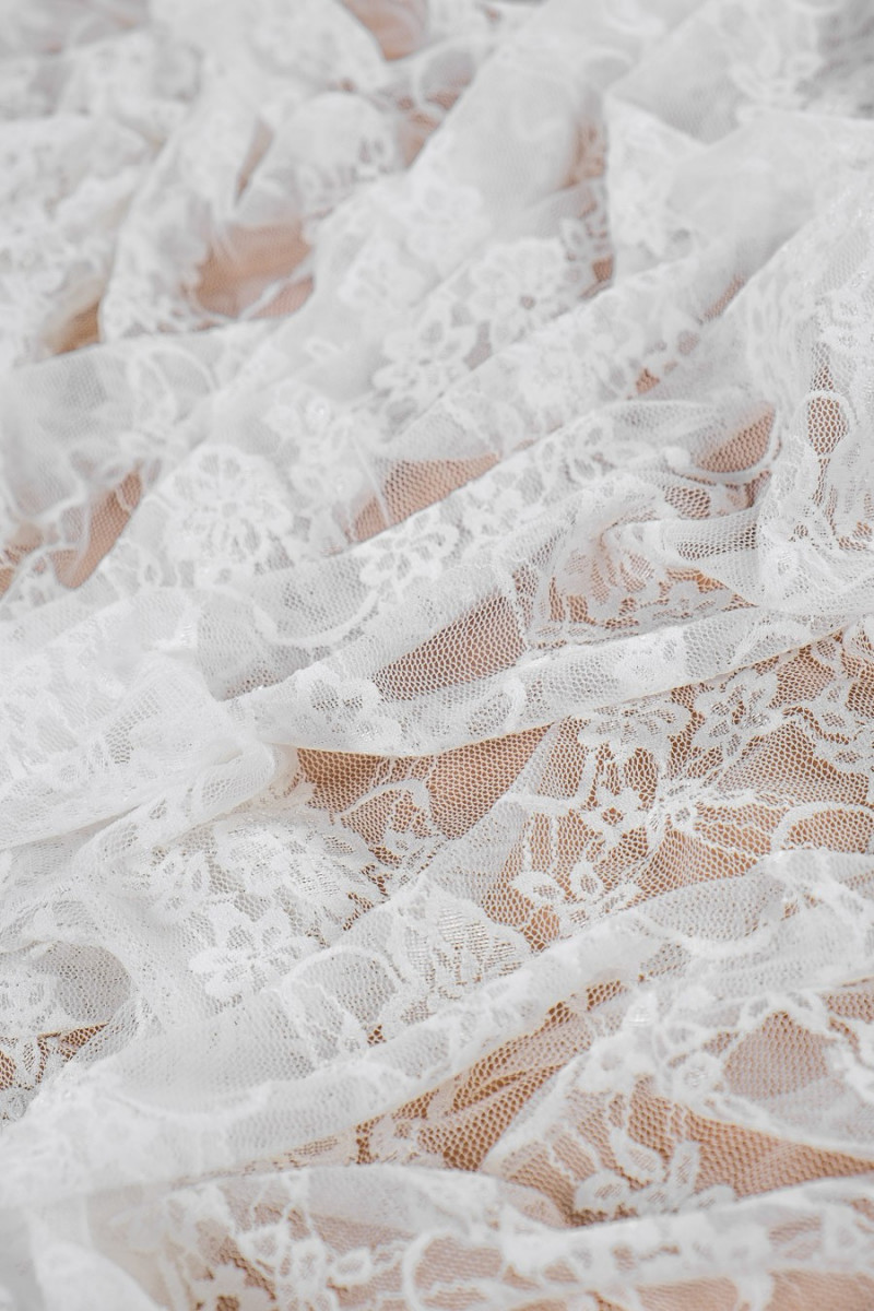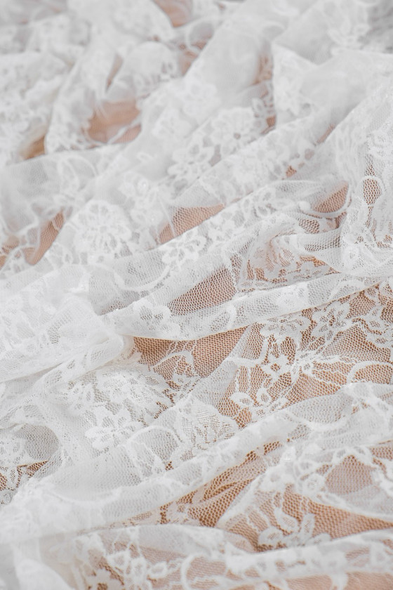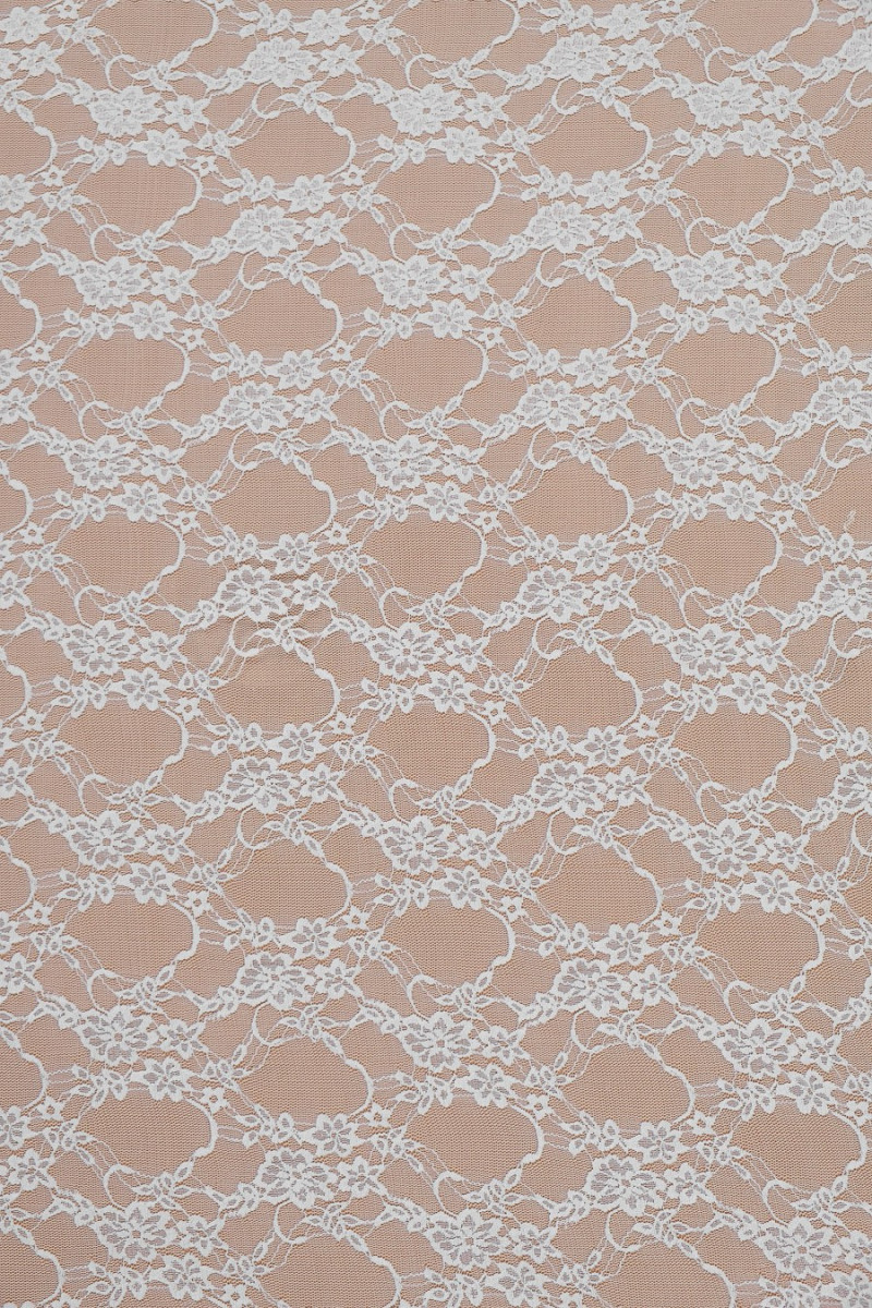 Vacker, elastisk off-white spets med blommotiv. Kronan är färdig på båda sidor med en guipure-tand. Perfekt för att sy en brudklänning, en blus i boho-stil.