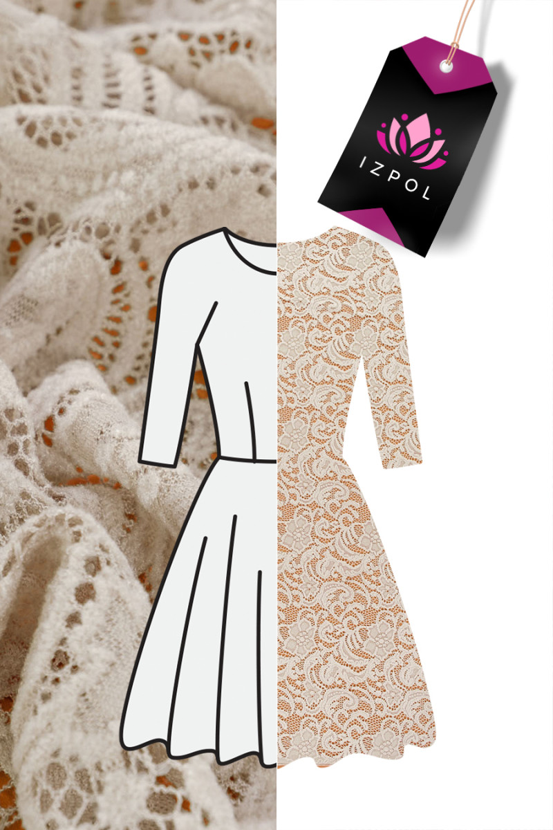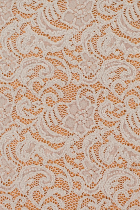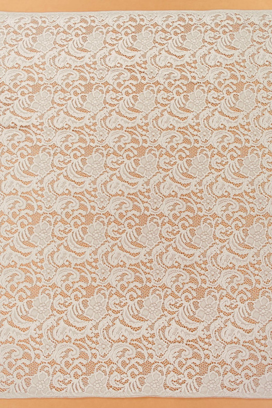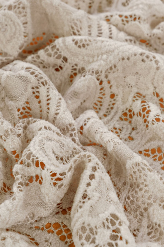 Kall beige spets med ett konvext blommönster - det ger intrycket av att den är gjord av ull.