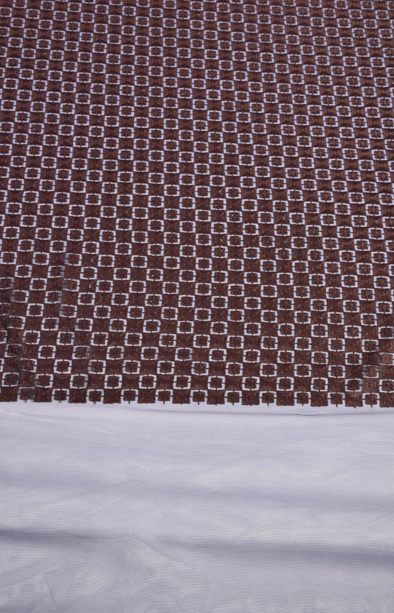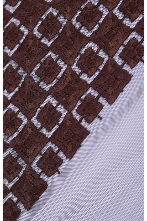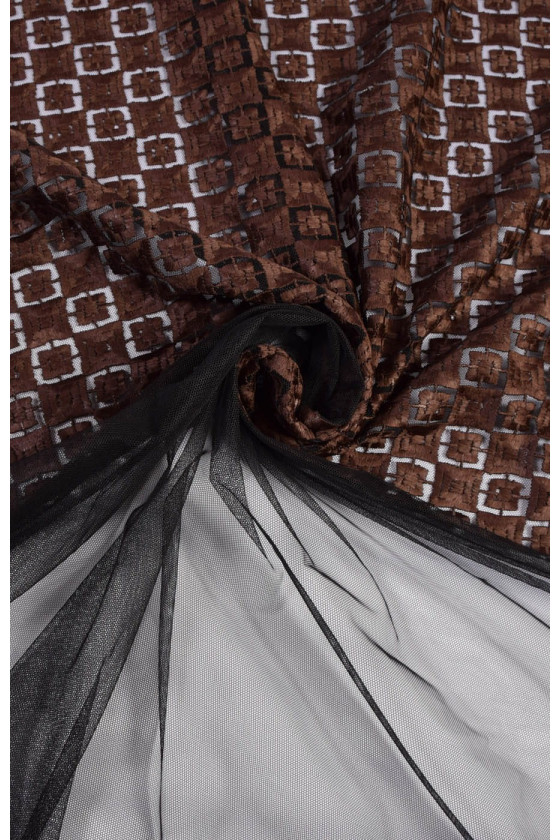 Spets med geometriskt mönster. Tyget kombineras med tyll. Bredden på tyget är 140 centimeter, varav 90 cm är spets, 50 cm är tyll (svart)