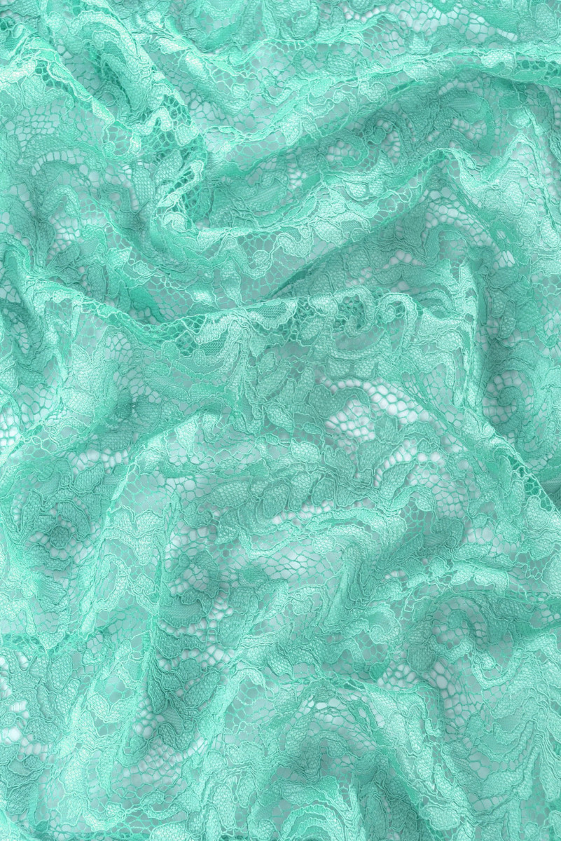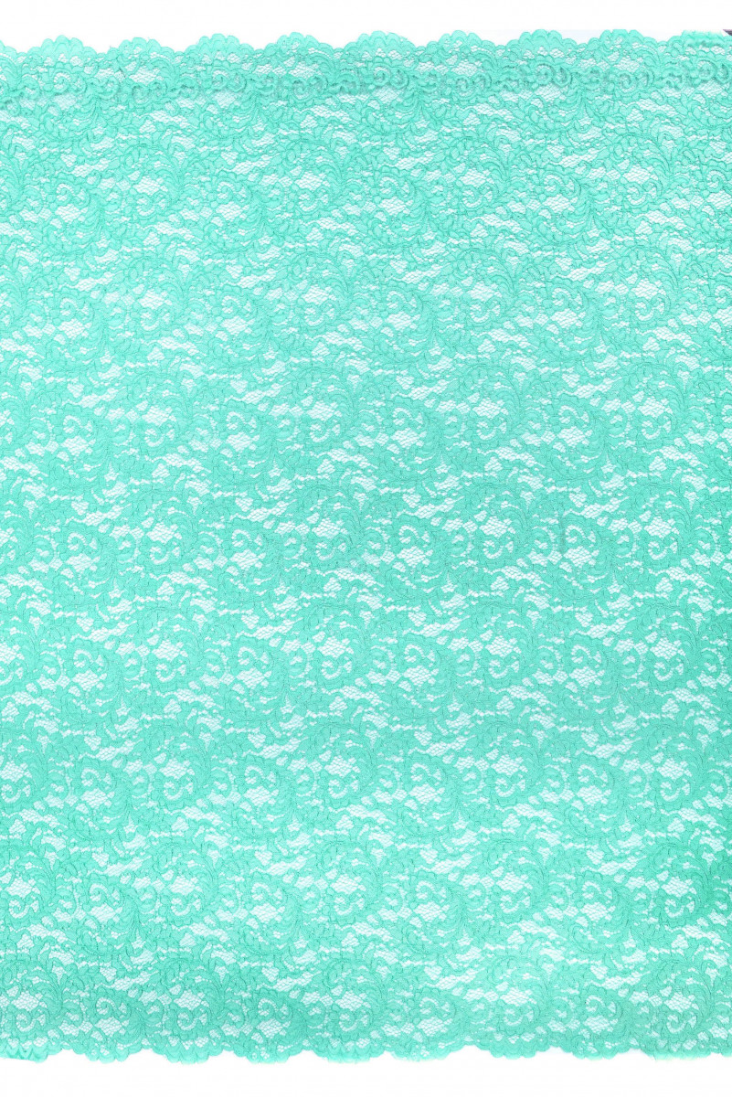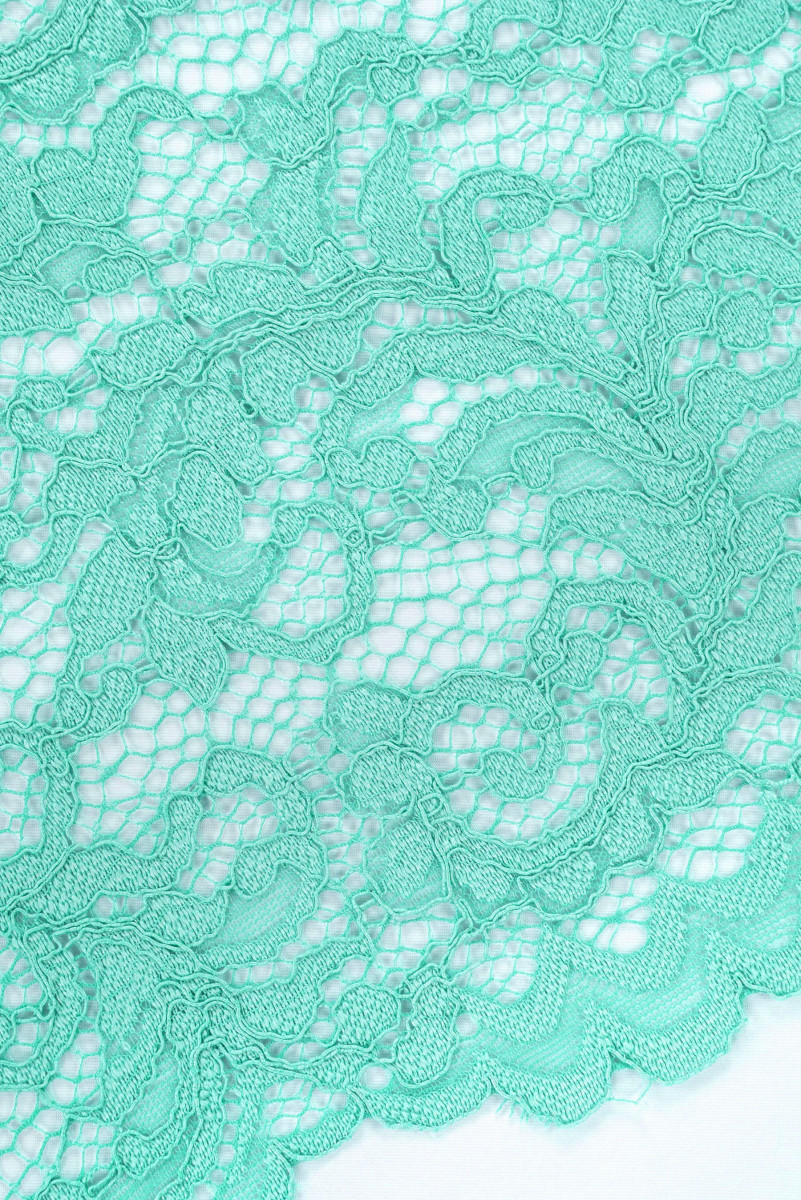 Italiensk spets i turkos med ett tätt blommotiv. Tyget är mjukt, icke-elastiskt, färdigt på båda sidor med en dekorativ tand.